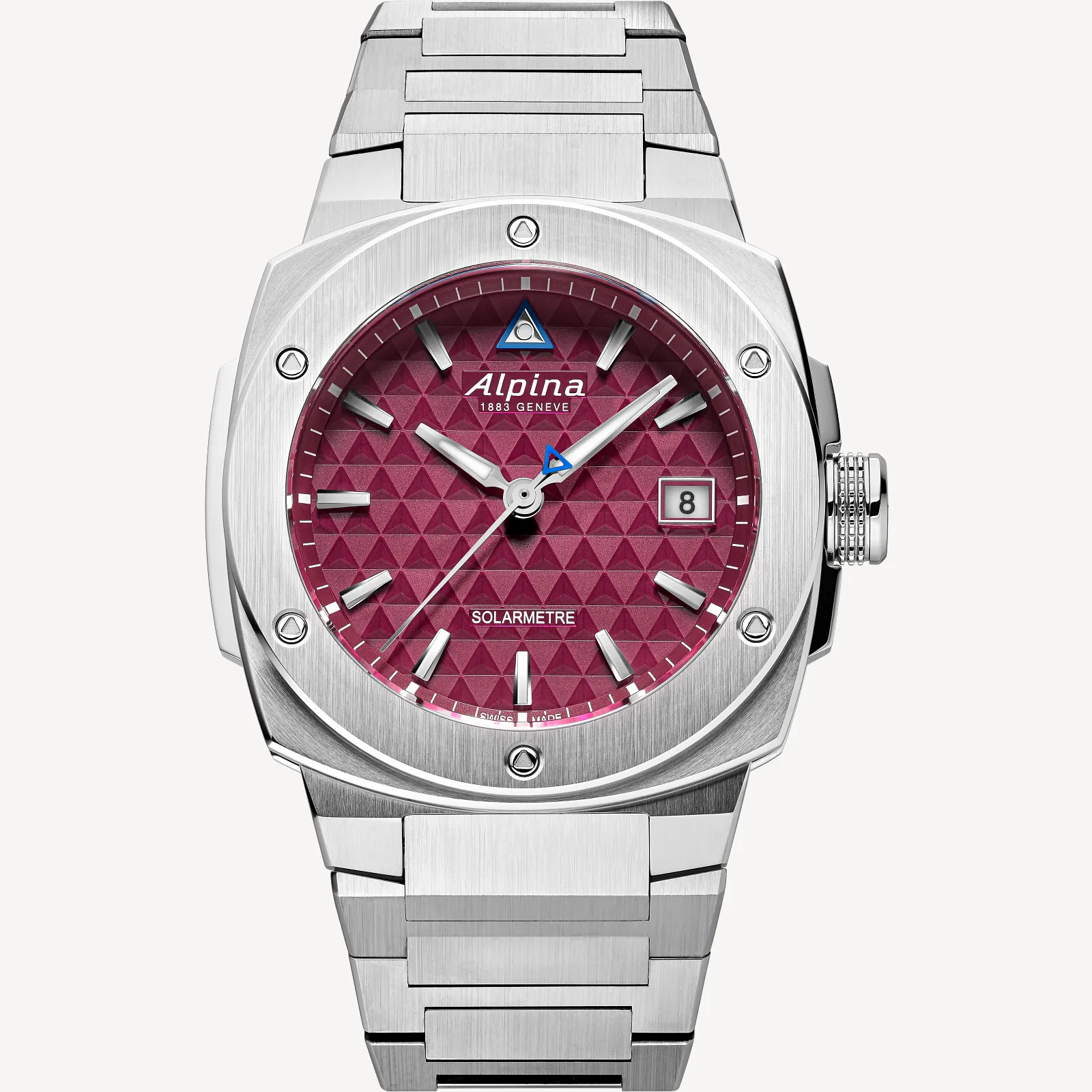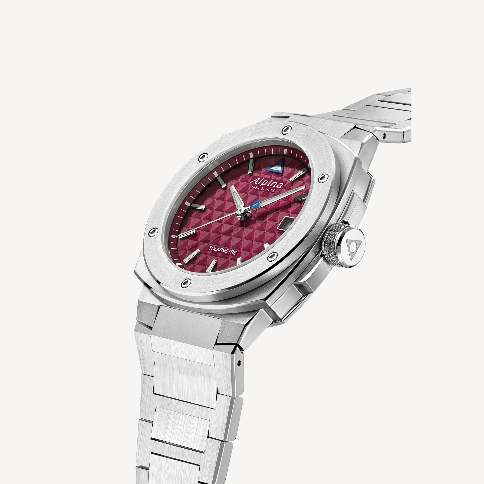 Built for total freedom, the Alpiner Extreme Solarmetre is the first solar-powered watch from Alpina. Melding sporty style, technical innovation and unwavering reliability, offered in a 37.5mm stainless steel case with the AL-140 solar quartz caliber with an exceptional power reserve of 10 months without exposure to light. A deep burgundy dial adds depth and distinction, finished with a matching stainless steel bracelet for a refined, modern look.