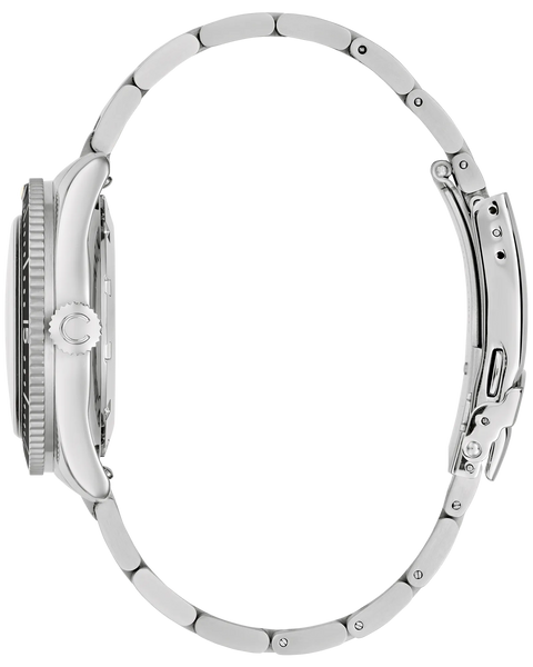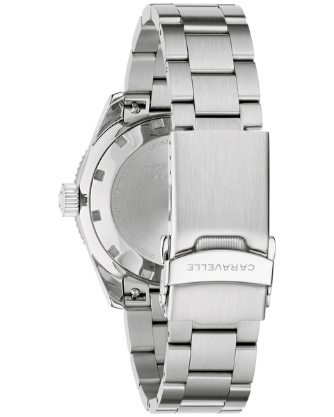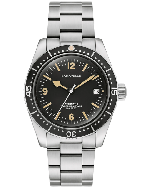 The return of an icon: The men's Caravelle Sea Hunter is reborn for the modern age. Inspired by one of Caravelle's most celebrated models, the new Caravelle Sea Hunter is sized for modern tastes at 39mm, with a case crafted from 316L stainless steel and echoing the sporting form of the original. Ensuring ideal legibility and functionality, a high-contrast black dial with a date display and luminescent hands and markers is complemented by a matching rotating 60-minute timing bezel. The Caravelle Sea Hunter is powered by a 21-jewel automatic movement with a power reserve of 42 hours. Paired with a 3-link stainless steel bracelet with a folding clasp and rated to 200m water resistance, this watch can go wherever you do so you can do whatever you want. Experience an icon remade with the men's Caravelle Sea Hunter.
