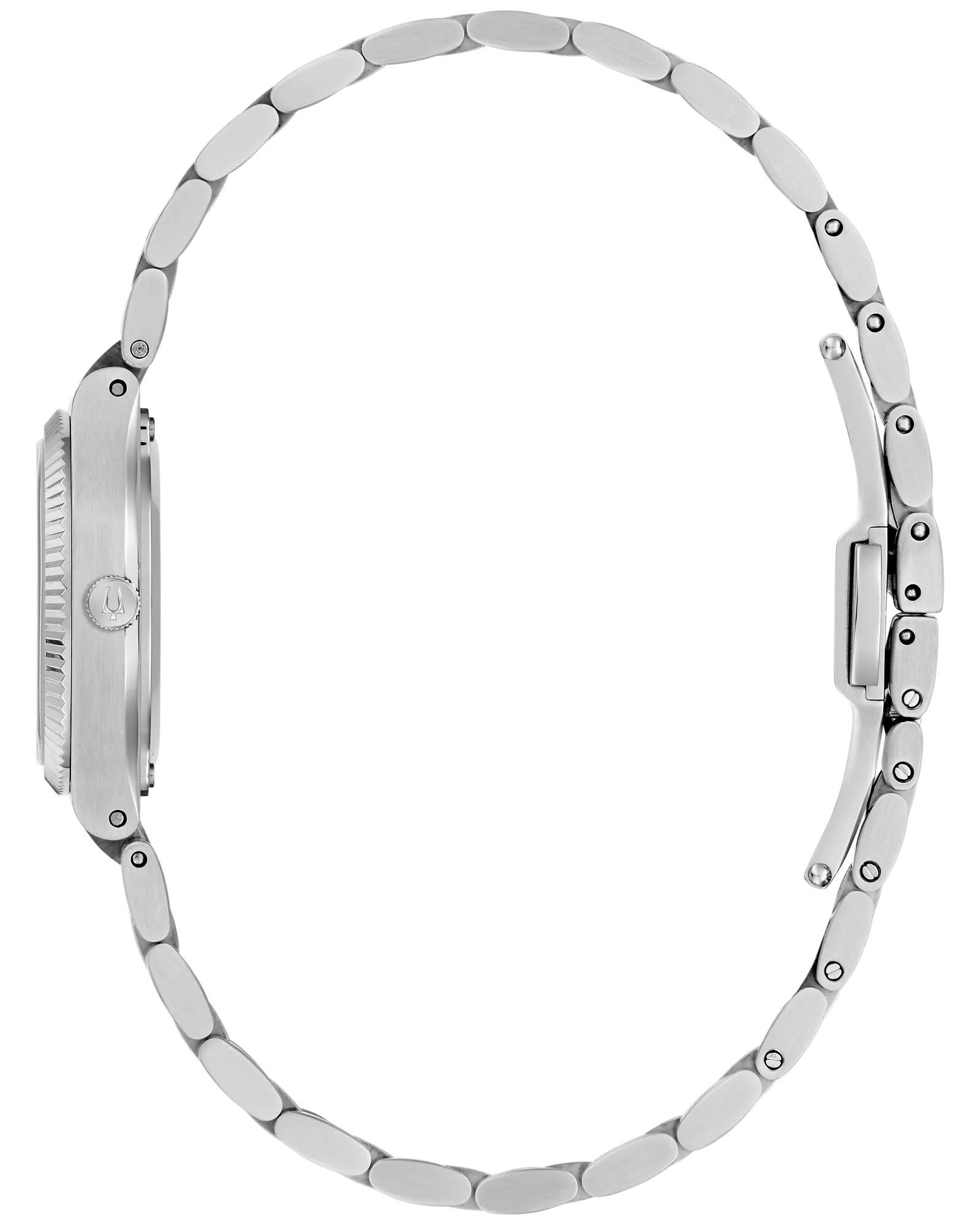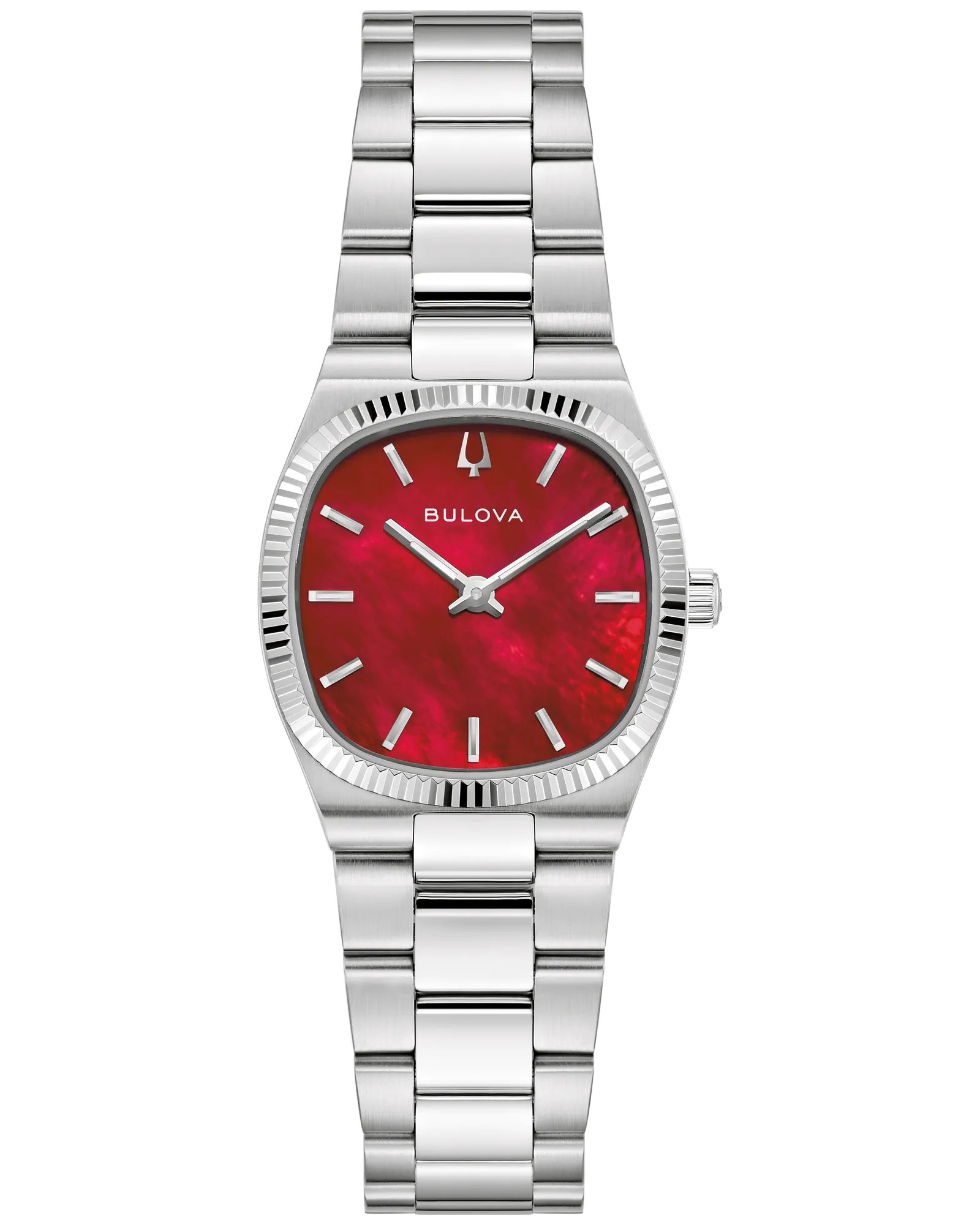 Drawing inspiration from the incredible Bulova Super Seville of the 1970s, the Super Seville Mini delivers classic aesthetics for timeless appeal. With versatility for every wardrobe, the 25mm stainless steel case impresses with a seamless silhouette transitioning into the matching integrated 3-link stainless steel bracelet, which features a push-button deployant clasp. An elegant, grooved coin edge bezel enhances the case and surrounds a flat sapphire crystal. Iridescent and mesmerizing, a red mother-of-pearl dial is appointed with polished /silver-tone hands and indices. Embrace an effortless elegance with the women's Bulova Super Seville Mini.