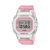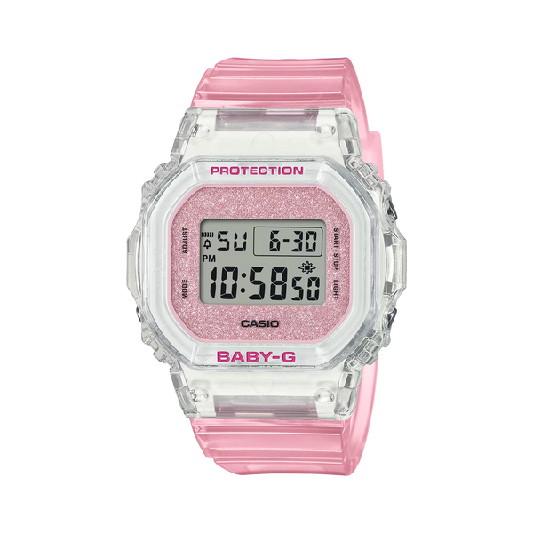 While maintaining the compact, angular style of the BGD565, this BABY-G takes on see-through color with a bezel and band in translucent resin and glittering dial for an added touch of luxe flair.
