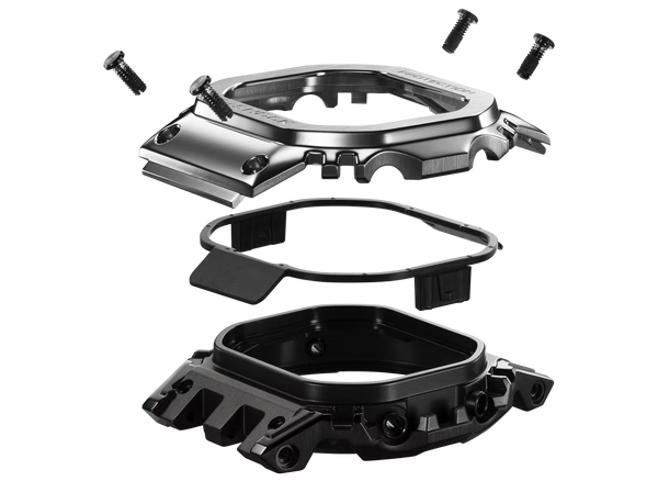 We kept the iconic form of the original G-SHOCK, while developing a new structure that extends the case all the way to the lugs to even further mitigate shock transmission. The intricate, modern shape, seen from the side, highlights the design's structural beauty. An internal protector made of resilient resin temporarily deforms to absorb shocks, achieving a timepiece with a full-metal exterior that meets G-SHOCK shock-resistance standards. The stainless-steel case employs a screw-lock case back to ensure a tight seal.