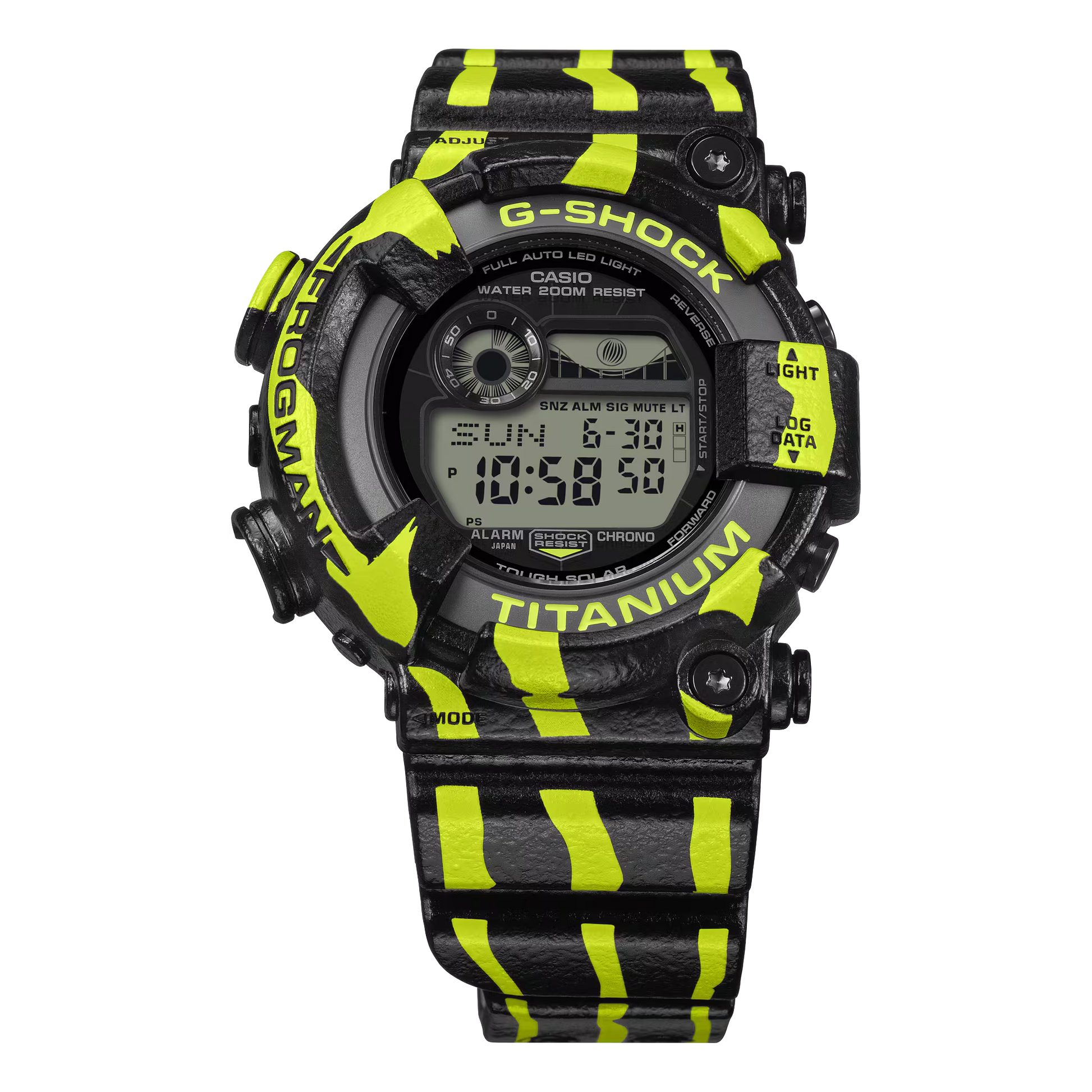 Bold vertical stripes in fluorescent green stand out against a black base for a striking, rugged look that showcases the dart frog's intensity. The band and bezel are finished with a spray coating to evoke the texture of the frog's skin. And the case back is, of course, engraved with the iconic diving frog character featured on every Frogman timepiece.