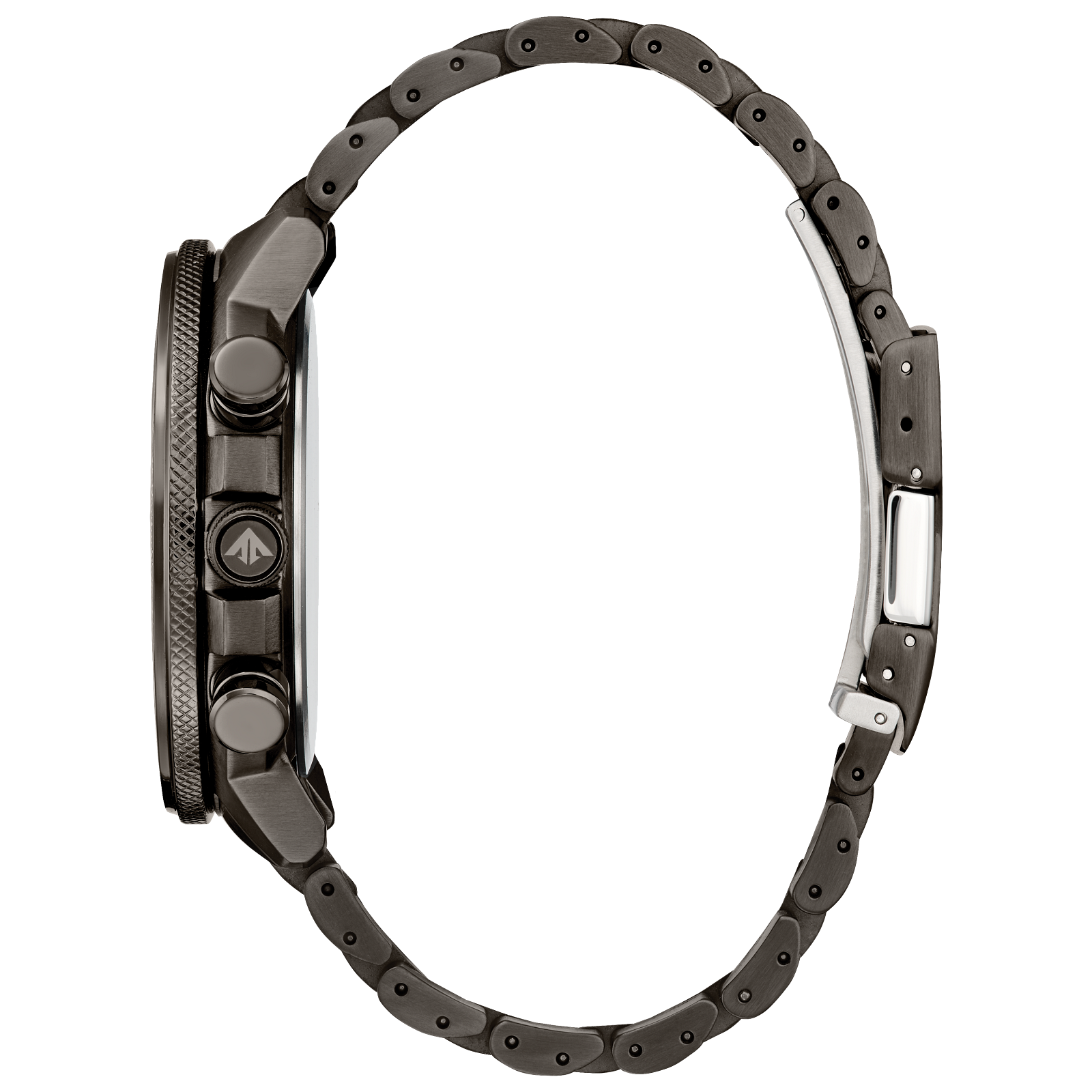 A bold 46mm stainless steel case in a dark gray tone centers the design, with the professional-grade pilot's watch mission-ready on the wrist, fully equipped with a bold set of chronograph pushers, 5-link steel bracelet, and an outer slide rule bezel.
