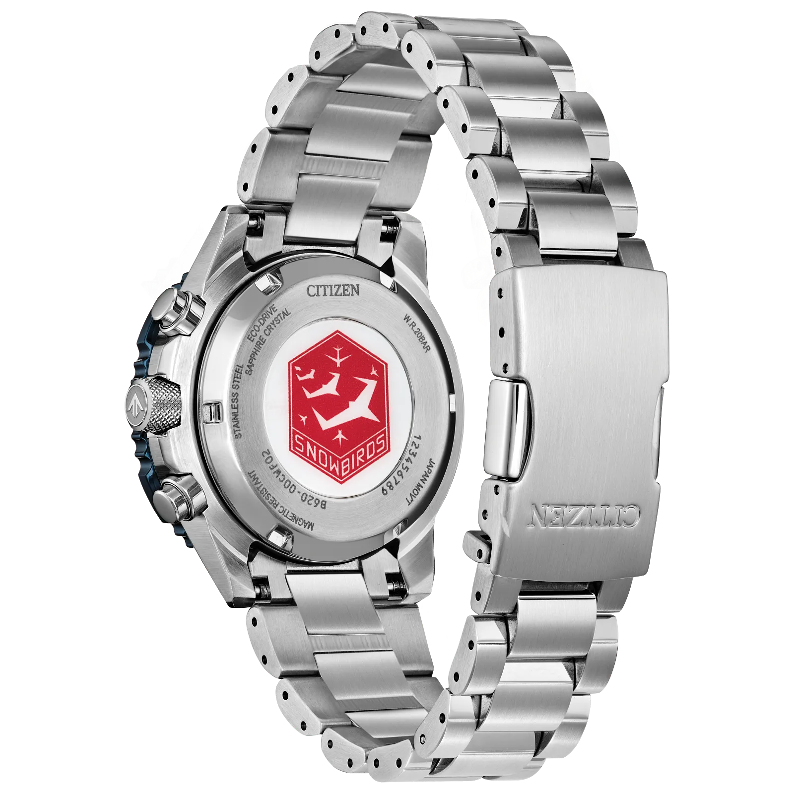 On the wrist, the watch's silver-tone stainless steel case measures 40mm in diameter, wearing boldly with its sharp faceting and satin finishing, while a slide-rule scale on the bidirectional blue and red ion-plated bezel provides additional flight utility. A triple-link stainless steel bracelet secures the timepiece. On the dial, a Snowbirds colorway with black accents adds to the watch's superior legibility, while a sapphire crystal and 200m of water resistance protect it all. Functions include a 1/5 second chronograph measuring up to 60 minutes, 12/24 hour time displays, and a date indicator. The movement is protected via a Snowbirds' insignia-signed case back, and is powered by our proprietary Eco-Drive technology - sustainably powered by light and never needing a battery. Caliber B620.