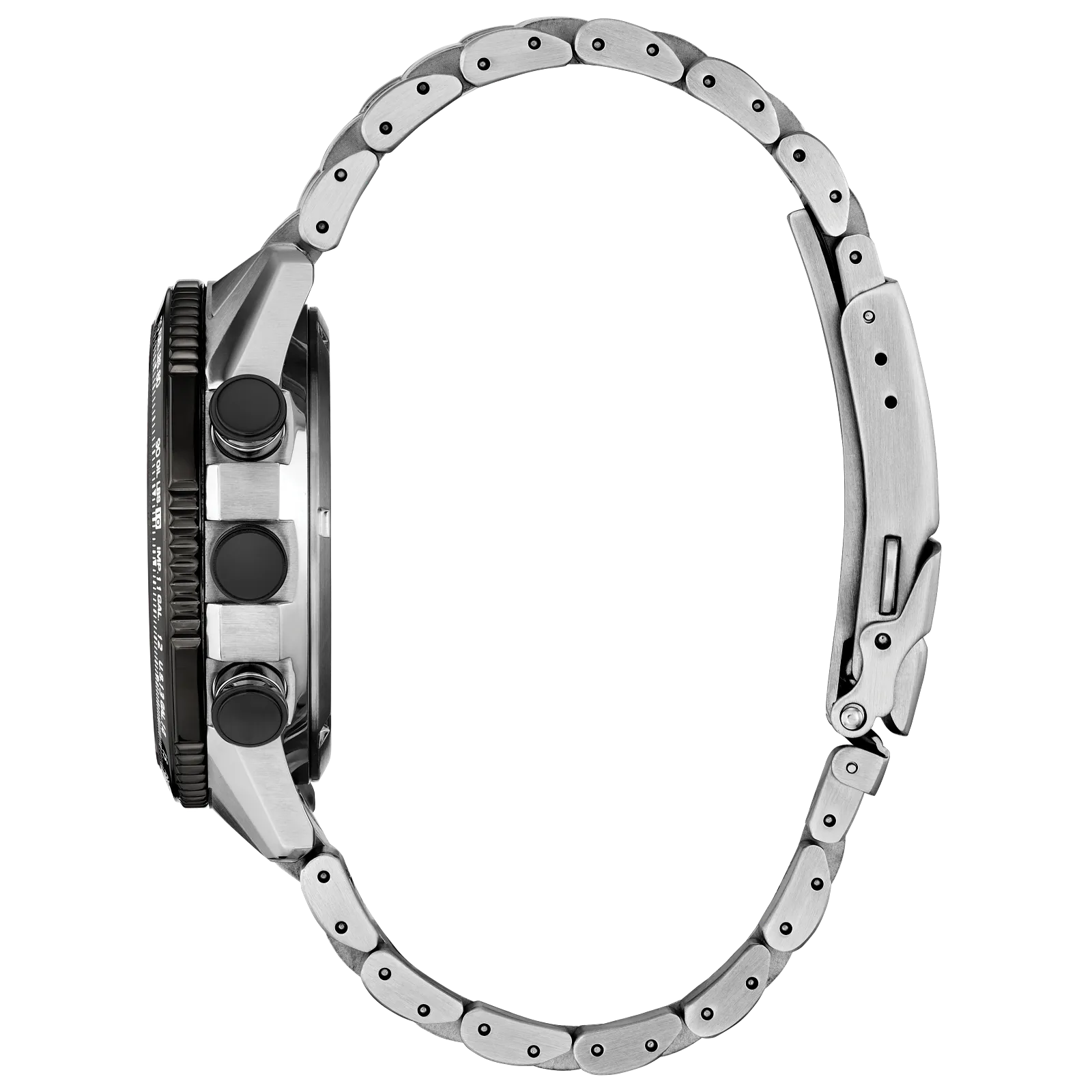 Reach a higher altitude in style and performance with the new Promaster Skyhawk U830. This action-ready chronograph features a black- and silver-tone stainless steel case and a captivating analog-digital dial, with its bold 43mm shape secured to the wrist via a sharply finished triple-link bracelet. A rotating slide-rule bezel alongside a modern set of pushers and a matching crown round out the sporty styling of the case.