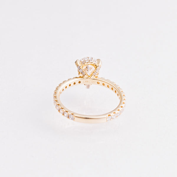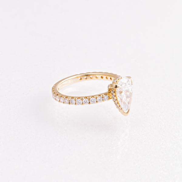 This stunning engagement ring features a radiant 2.22-carat pear-shaped lab-grown diamond, GIA-certified with an exceptional E color grade and VVS2 clarity, exuding brilliant sparkle. Set in warm 14-karat yellow gold, the pear cut creates an elegant, elongated silhouette that flatters the finger. The ring is enhanced by a three-quarter pavé band, adorned with lab-grown diamond accents that add captivating shimmer from every angle. Crafted in a size 6.5, this ring combines timeless sophistication with modern craftsmanship, making it the perfect symbol of love and commitment.