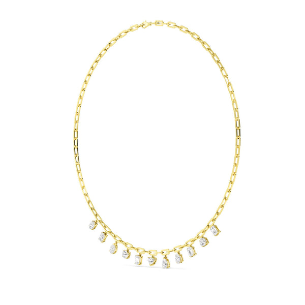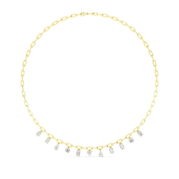 Effortlessly modern yet eternally refined, this 2.57ct Mixed-Shape Lab-Grown Diamond Paperclip Necklace is a contemporary take on classic diamond elegance. Eleven lab-grown diamonds—each uniquely cut in a mix of round, oval, heart, pear and baguettes—gracefully dangle from a polished 14k yellow gold paperclip chain, catching light with every movement.