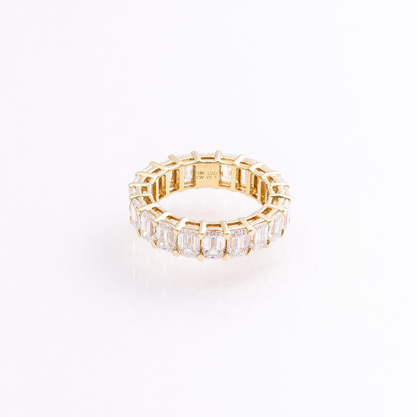 Discover timeless elegance with this stunning emerald cut eternity band, featuring a total of 6.63 ct of lab-grown diamonds. Each stone is IGI certified with VS2 clarity, ensuring exceptional quality and sparkle. The continuous row of meticulously set emerald cut diamonds wraps around the band, offering a sophisticated and radiant look from every angle. Crafted in luxurious 14K yellow gold, this eternity band is the perfect blend of classic style and modern brilliance, ideal for stacking or wearing alone as a bold statement of love and commitment.