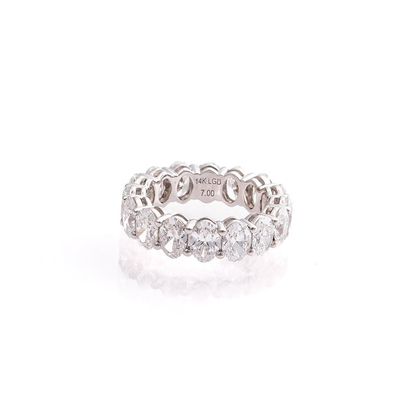 This magnificent eternity band showcases a resplendent array of 7-carat oval-cut lab-grown diamonds, each with an exceptional F color grade and VS1 clarity, delivering unparalleled sparkle and sophistication. Crafted in sleek 14-karat white gold, the band features a continuous circle of meticulously set oval diamonds, ensuring brilliance from every angle. Designed in a size 7, this luxurious ring combines timeless elegance with modern craftsmanship, making it an exquisite choice for a wedding band, anniversary gift, or a dazzling statement piece symbolizing eternal love and commitment.