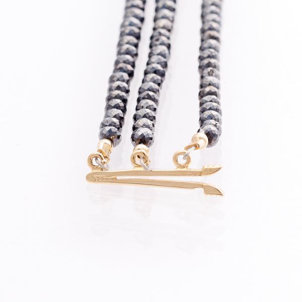 Elevate your style with our exclusive Black Diamond Multi-Strand Necklace, handcrafted with 99 carats of natural black diamonds that captivate with their mysterious allure. Three delicate strands, totaling 18 inches, cascade elegantly, secured by a luxurious 14K gold clasp, accented with 14K gold crimps and polished gold balls. Each diamond is ethically sourced, ensuring brilliance with a conscience. Perfect for gala evenings or elevating everyday looks, this necklace blends bold sophistication with timeless craftsmanship. Make a statement with a piece as unique as you are—shop now for unparalleled luxury.