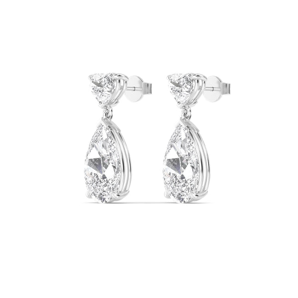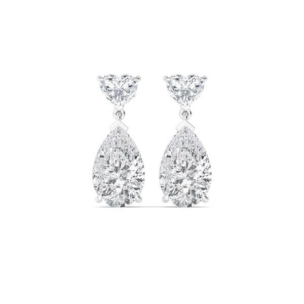 Distinctive in shape and brilliant in design, the Heart & Oval Duo Drop Lab-Grown Diamond Earrings feature 11.88 carats total of lab-grown diamonds, artfully paired to create a striking silhouette. Crafted in 14k white gold and secured with push-back closures, each earring balances elegance with modern edge. IGI certified for quality and authenticity.