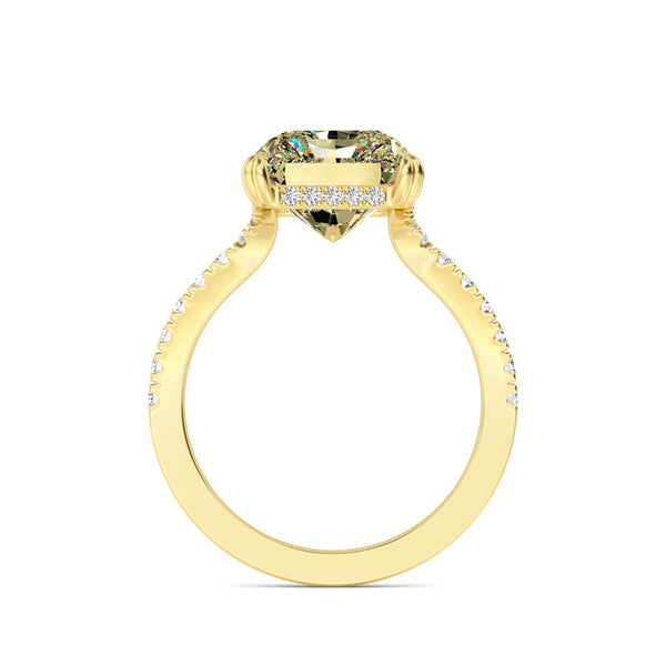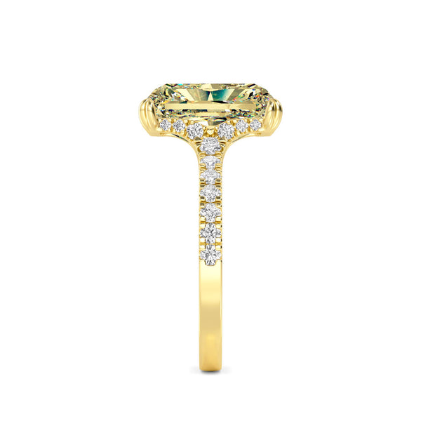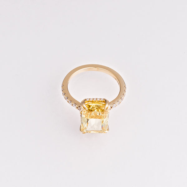 This stunning engagement ring showcases a mesmerizing 6.28-carat yellow radiant-cut gemstone, exuding vibrant elegance and exceptional brilliance. Crafted in luxurious 14-karat yellow gold, the ring features a hidden halo of sparkling lab-grown diamonds, adding a subtle yet dazzling effect beneath the center stone. The delicate pavé band, also adorned with lab-grown diamond accents, enhances the ring's radiance, ensuring it sparkles from every angle. This exquisite piece combines timeless sophistication with modern allure, making it the perfect symbol of love and commitment.