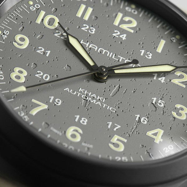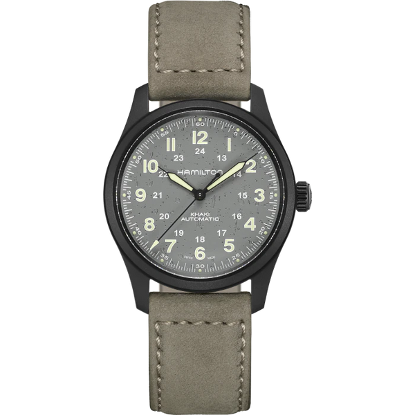A century-long pedigree in military timepieces combined with lightweight materials make the Khaki Field Titanium Automatic the ultimate all-purpose watch for modern heroes. Truly fit for life in the field, the 38mm case size accentuates comfort and adaptability with a historically authentic design.