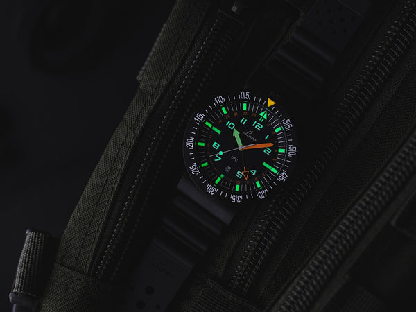 Hands: Hour hand filled with luminous material Superluminova C3, minute hand filled with Superluminova orange, second hand white and filled with Superluminova C3, UTC hand with skeletonized arrowhead covered with Superluminova orange