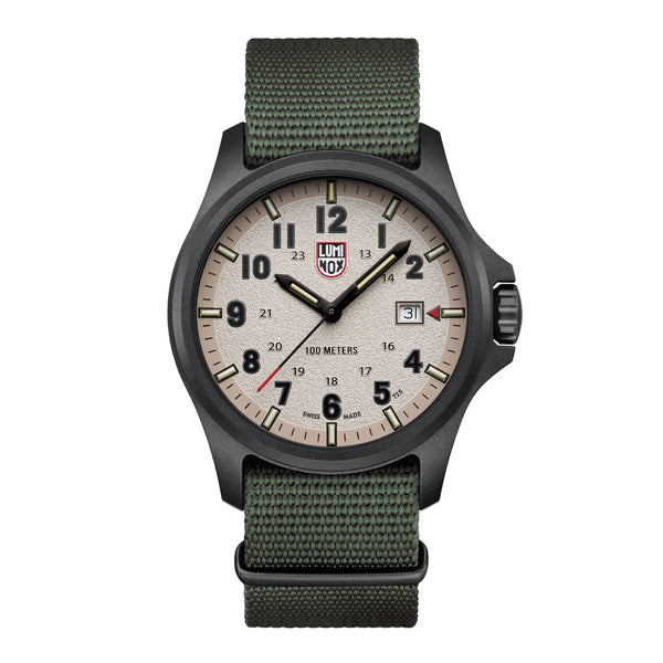 This Atacama Field 1970 watch is inspired by its namesake, the Atacama Desert. The design with a warm grey dial with textured finish and black numerals evokes the terrain and rugged landscape of the desert. The timepiece presents a large dial that displays the 12- & 24-hour clock, along with a red tipped second hand and red arrow next to the date at 3 o'clock for instant readability. The dial is protected by sapphire crystal with anti-reflective coating. The 43 mm CARBONOX™ case is matched with a black rubber strap that can also be swapped with the additional second strap that comes with the watch, a dark green webbing NATO strap.