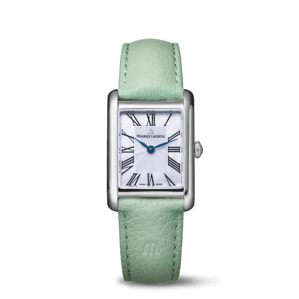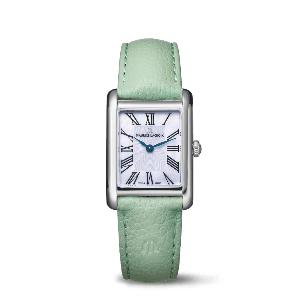 Bracelet/Strap: Green leather strap, featuring the Maurice Lacroix 'm' logo