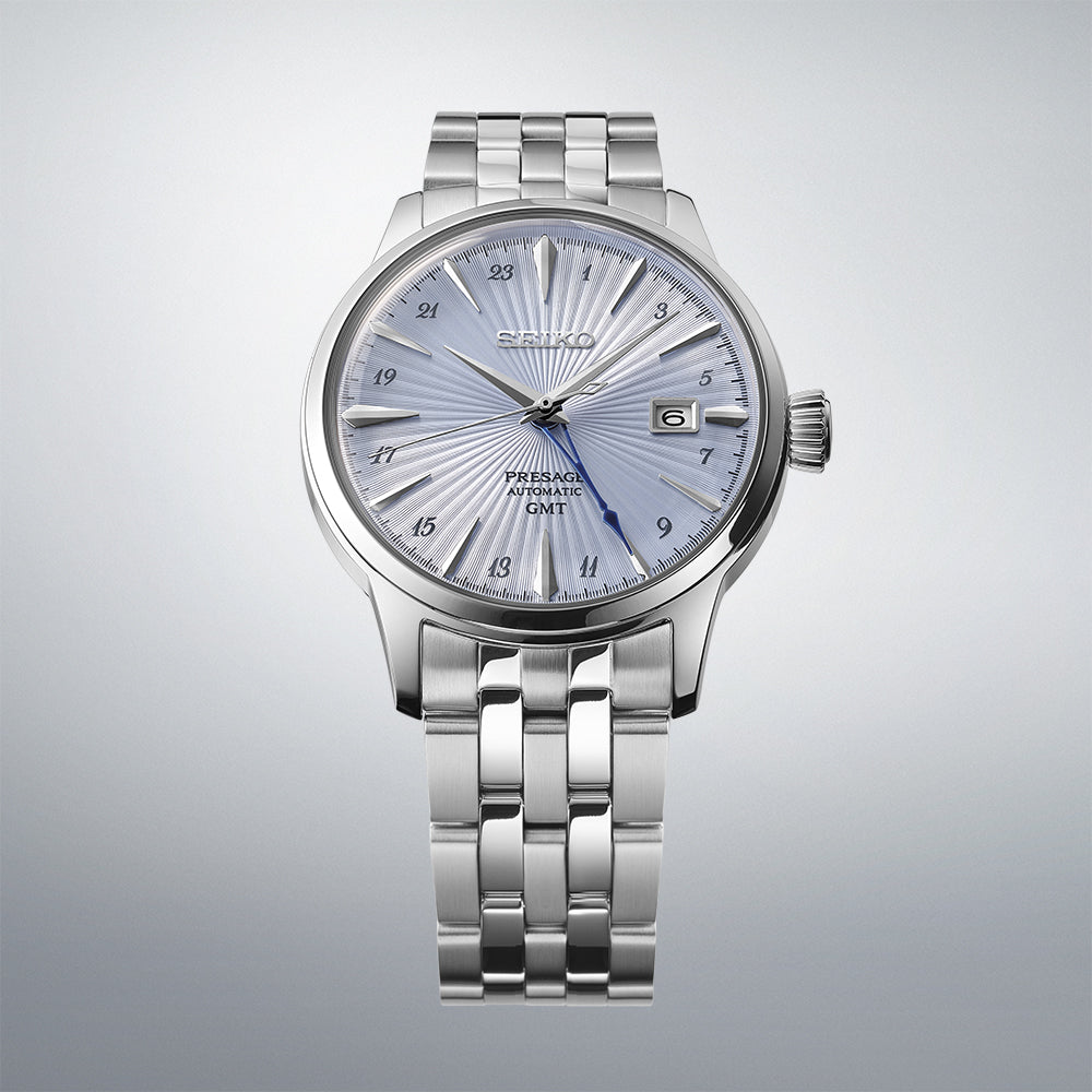 Seiko Presage Cocktail Time watches are inspired by Japanese cocktail culture and specific drinks from the Star Bar in Tokyo's sophisticated Ginza area. Perfectly balancing sweet and sour flavours, the 'Skydiving' cocktail is a mix of rum, lime juice and blue curaçao, giving it a pale blue hue.