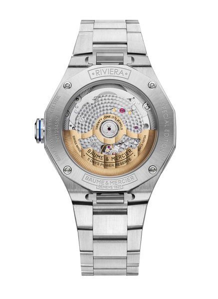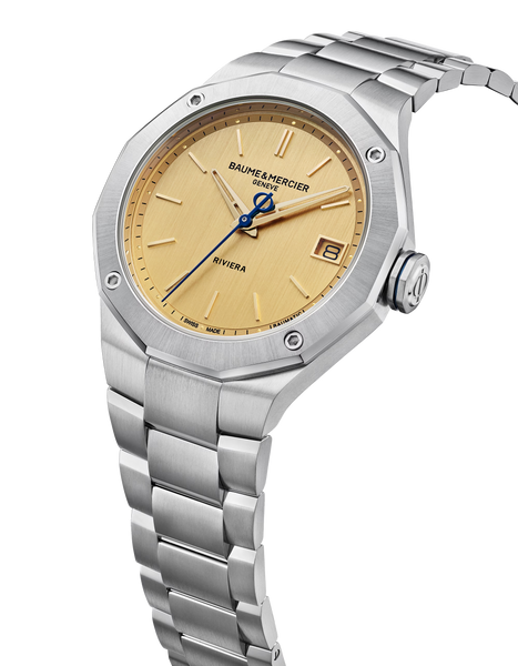 The Riviera 10822 of 39mm features a polished and satin-finished stainless steel dodecagonal case, protected by a scratch-resistant sapphire crystal and houses a luminous vertical brushed gilded dial with vintage appeal. The dial features riveted gilded indexes and a blue seconds hand with Phi logo on the counterweight. It is equipped with a Manufacture self-winding Baumatic movement (BM13-1975A) with a 5-day power reserve and a water resistance to 10 ATM. The interchangeable stainless-steel bracelet features a reliable system for tool-free changes.