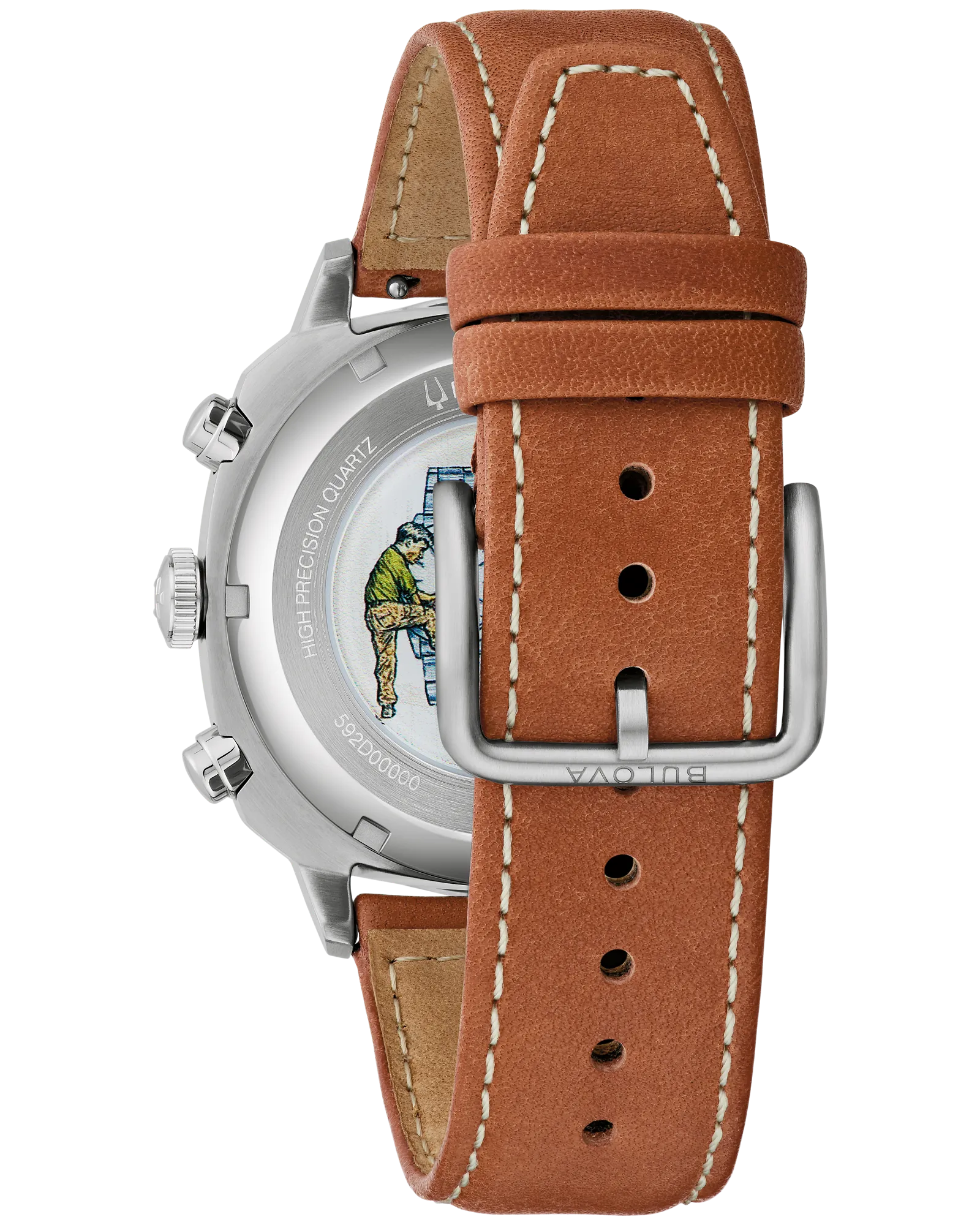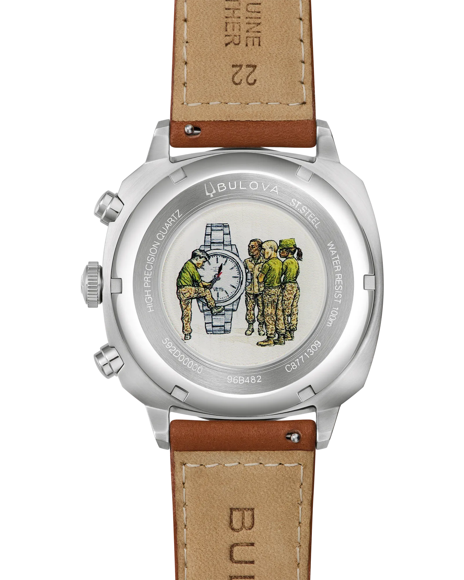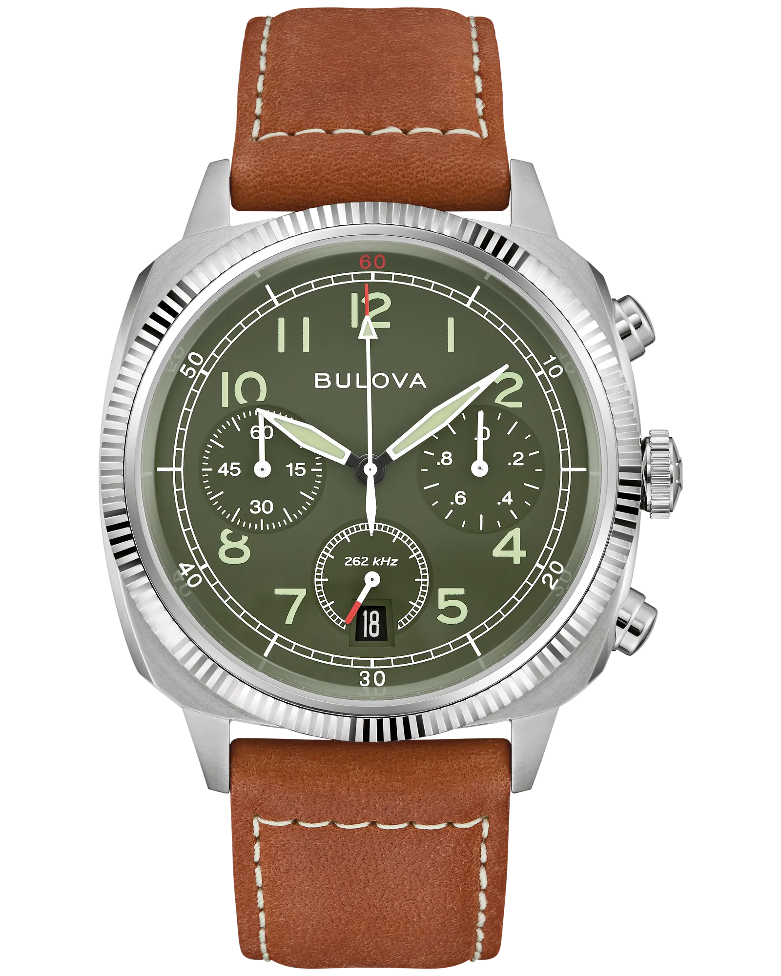 Bulova's latest military-inspired timepiece is a revamped style from the past. Defined by it's stainless steel cushion case and coin-edge bezel, this 6-hand chronograph watch affords functionality and iconic heritage style. The military green dial is appointed with three subdials and a date, with beige accents to create contrast and capture classic military hues. The watch is powered by the brand's proprietary high precision quartz movement, a revolutionary mechanism vibrating at a remarkable 262kHz, accurate to seconds per year with increased resistance to temperature changes, and with a sweeping chronograph seconds hand. Partnering with the Veteran Watchmaker's Initiative, 10% of every sale will go help provide employment opportunities in watchmaking for U.S. military veterans. For accuracy, style, and to support an exceptional cause, this Bulova men's watch can't be beat.