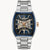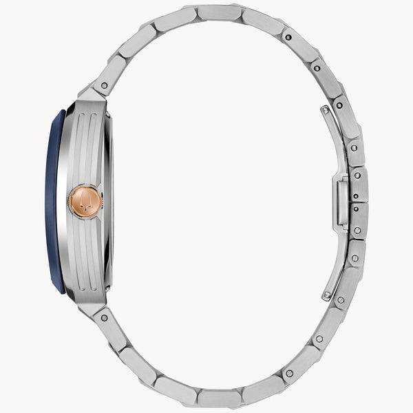 This Bulova men's watch from the Maquina collection offers daringly avant-garde design. The watch features a 40mm rose gold- and silver-tone stainless steel case with a curved sapphire crystal, a blue bezel, and a silver-tone stainless steel bracelet with a push-button deployant closure. The blue patterned dial with black dial ring and bridges has rose-gold tone hands and markers with luminescent fill and a central aperture revealing the inner workings of the 21-jewel automatic, also visible through a transparent case back, skeletonized movement which has a 42-hour power reserve. With its mechanical heart and unrivaled modern form, this Bulova men's timepiece offers a uniquely individual expression of style.