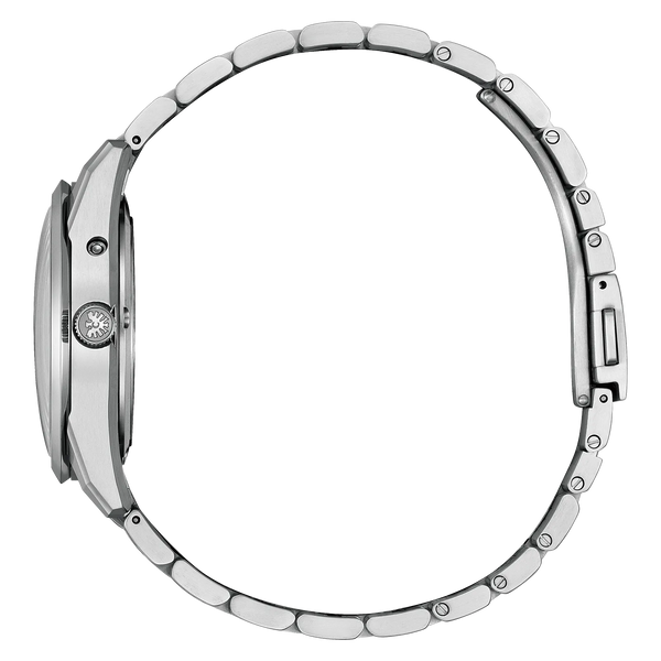 Inside the timepiece is the Citizen Caliber A060, accurate to ±5 seconds per year and equipped with Eco-Drive technology that's sustainably powered by any light and never needs a battery. Advanced features include a perpetual calendar, power reserve indicator, insufficient charge warning, energy saving function, shock detection, automatic hand position adjustment, time difference correction, midnight sharp calendar update function. Water resistant to 100 meters.