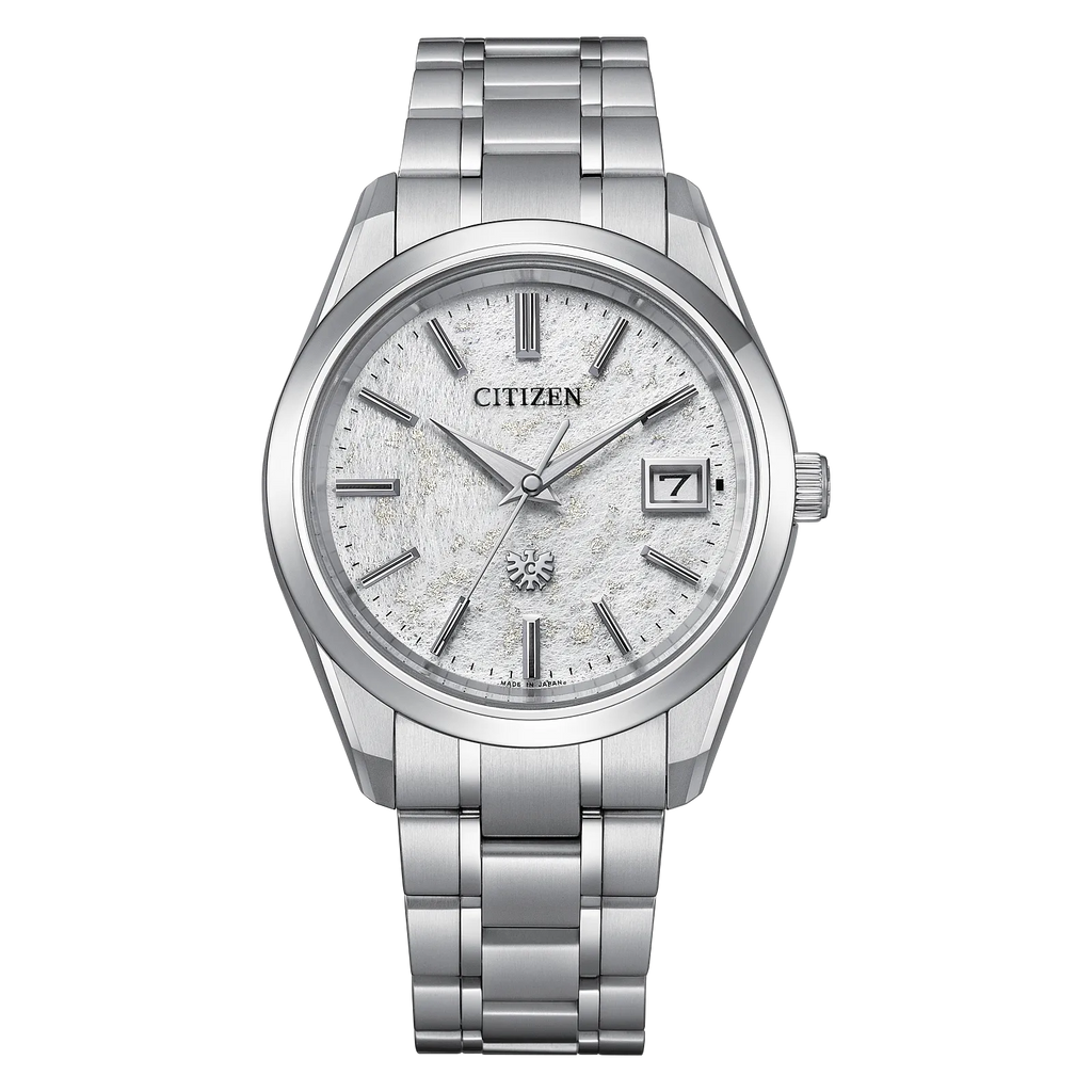 Superior precision meets the highest standards of quality in The CITIZEN. Representing the never-ending pursuit of the essence of the watch, this exceptional model serves as the ideal all-purpose timepiece perfectly balancing mechanical refinement with aesthetic intrigue. On the wrist, the watch measures comfortably at 38mm, with its silver-tone Super Titanium™ case faceted with sharp surfaces of brushed and polished finishing and complete with a matching five-link bracelet. A sapphire crystal protects its white dial, with its surface produced from Japanese washi paper to produce a look that beautifully plays with light, texture, and color. Towards the top of the display is the eagle mark, symbolizing the twin ideals of The CITIZEN - foresight and dedication to the pursuit of ideals, as well as the enduring connection between watch and wearer.