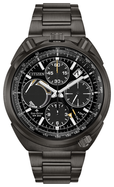 Paying homage to a retro 1973 CITIZEN Bullhead model, the newly modernized 100th Anniversary CITIZEN Limited Edition Tsuno Chrono Racer showcases a unique case styling, trendy color combinations and is sure to stand out on your wrist. A hand assembled movement, the Tsuno Chrono Racer features 1/5-second chrono, alarm, tachymeter, instantaneous fly back, power reserve and date. Seen here in a black ion-plated stainless steel case and bracelet and black dial with gold-tone accents. Featuring our Eco-Drive technology - powered by light, any light. Never needs a battery. Caliber number E210.