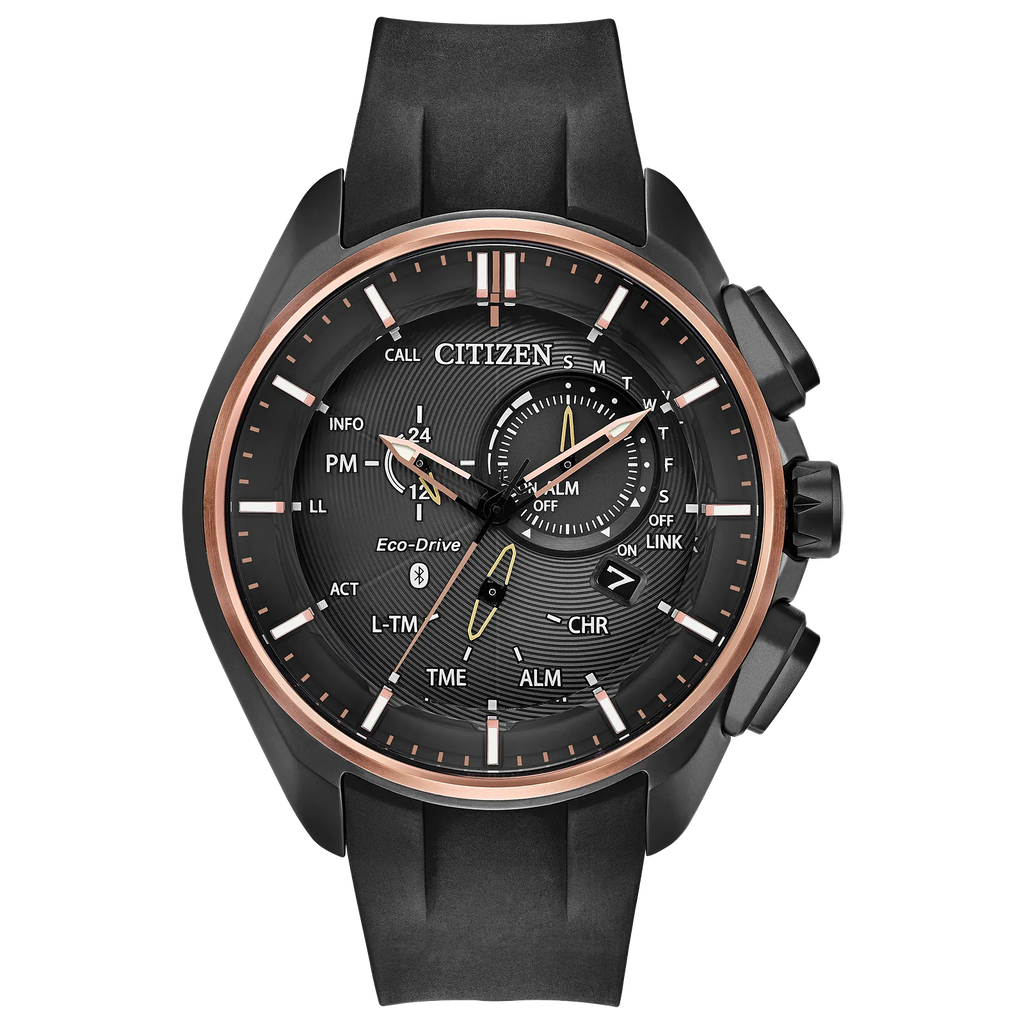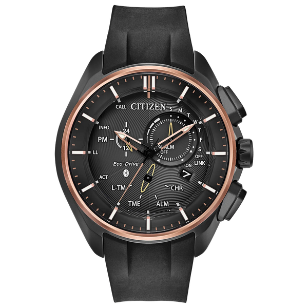 Time to unplug. The CITIZEN 100th Anniversary Proximity Pryzm requires zero wires or plugs for charging. This timepiece is a smarter watch for the tech-savvy consumer with Bluetooth compatibility to iOS and Android. The Proximity features a perpetual calendar, 12/24-hour time, dual time, alarm, power reserve, light level indicator, time and date sync. Additional capabilities include phone search/filter, visual/vibration alerts and more! This model appears in a Super Titanium™ case with black dial, rose gold accents and bezel with a uniquely cut sapphire crystal and black polyurethane strap. 2018 Good Design as awarded by The Chicago Athenaeum: Museum of Architecture and Design. Featuring our Eco-Drive technology - powered by light, any light. Never needs a battery. Caliber number W770.