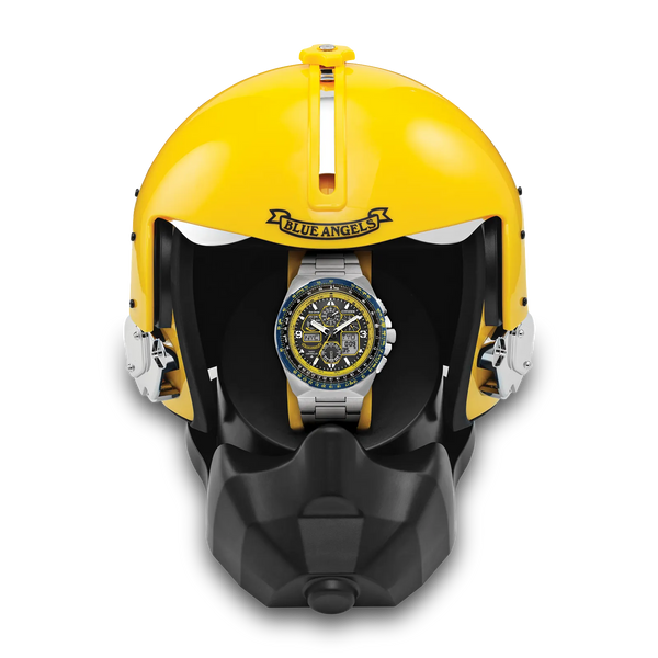 The mission of the Blue Angels is to showcase the pride and professionalism of the U.S. Navy and Marine Corps through their expert precision and dedication to excellence and service. This exceptional timepiece has a silver-tone stainless steel case with a blue ion-plated bezel, yellow inner bezel, and blue dial encased in sapphire crystal. It features atomic time clock synchronization for superior accuracy, time adjustment available in 43 world cities, a 1/100 second chronograph that measures up to 24 hours, a perpetual calendar, 2 alarms, 99-minute countdown timer, digital backlight display, Universal Coordinated Time (UTC) display, and a power reserve indicator. The silver-tone stainless steel bracelet band fastens with a fold over clasp with hidden push buttons. The Blue Angel's insignia is replicated on the case back. This distinctive sports watch utilizes our Eco-Drive technology that's sustainably powered by light and never needs a battery, and is water resistant up to 200 meters. Reach a higher altitude in style and pay tribute to the elite Blue Angels with this high-performance timepiece.