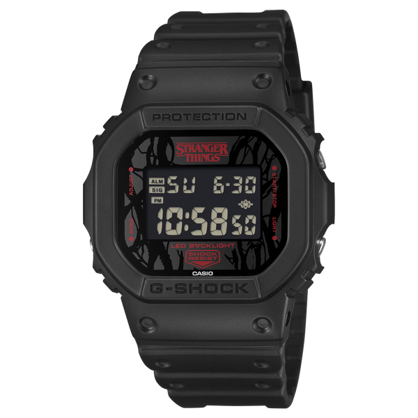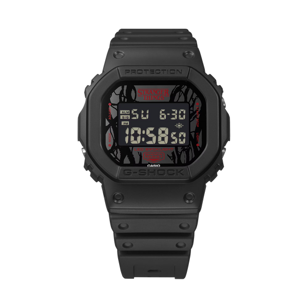 This timepiece is based on the DW-5600. Drawing from the dual worlds of the story - the familiar reality and the eerie "Upside Down" - the design weaves key elements of the series into every detail.
