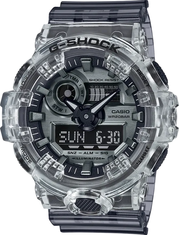 G-SHOCK is the watch brand that is always finding ways to incorporate world culture icons into exciting new designs. This new model combines popular semi-transparent resin with metallic colors to create a mix that captures the look of the 80's along with today's fashions. Base model is the dynamic style GA-700. This model features two-tone coloring that matches bright hues with semi-transparent resin for the case and band.