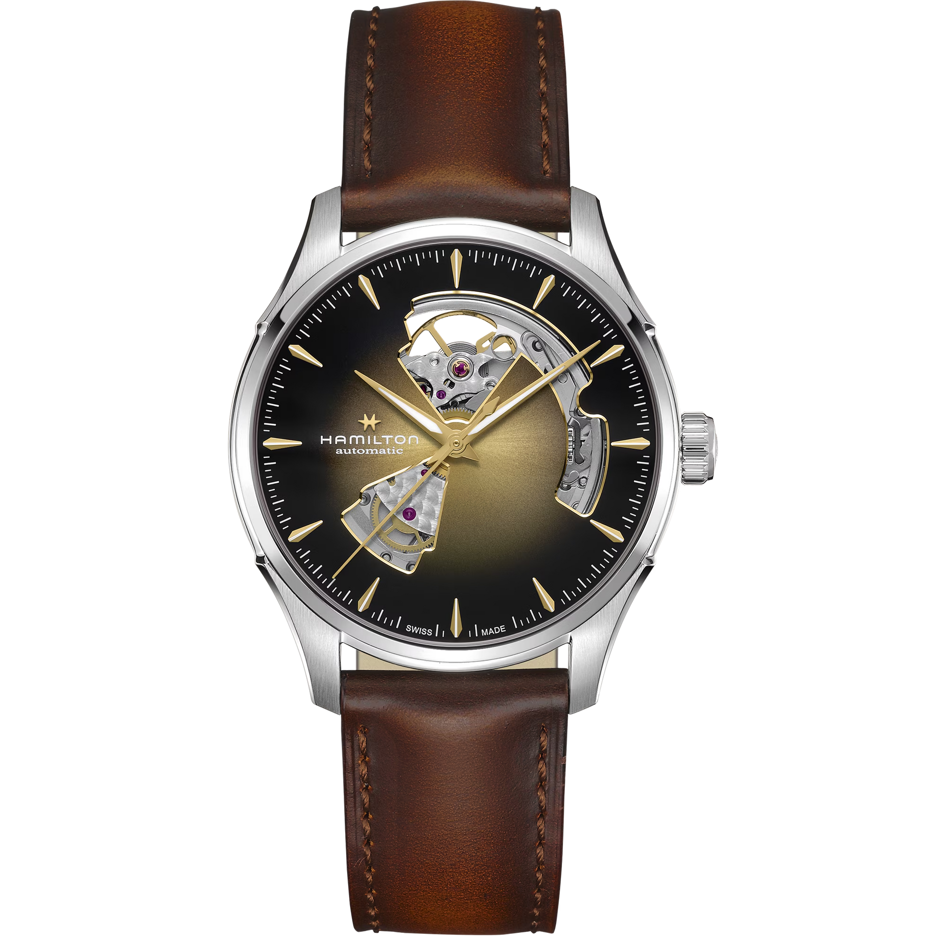 Elegant and timeless, the Jazzmaster Open Heart 40mm in timeless silver pairs its sunray-brushed dial with a rich brown leather strap for a warm, refined finish. Smoky effects highlight the open-heart detail, revealing the movement within. A classic dress watch that speaks to tradition while embracing contemporary style.