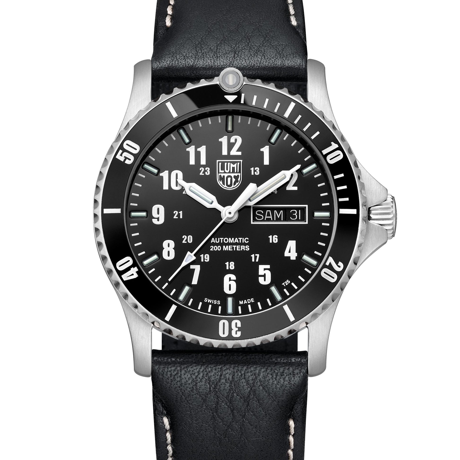 Strap (Leather): FE2401.20Q black leather strap with off-white stitching and Luminox signature buckle, 24/22mm