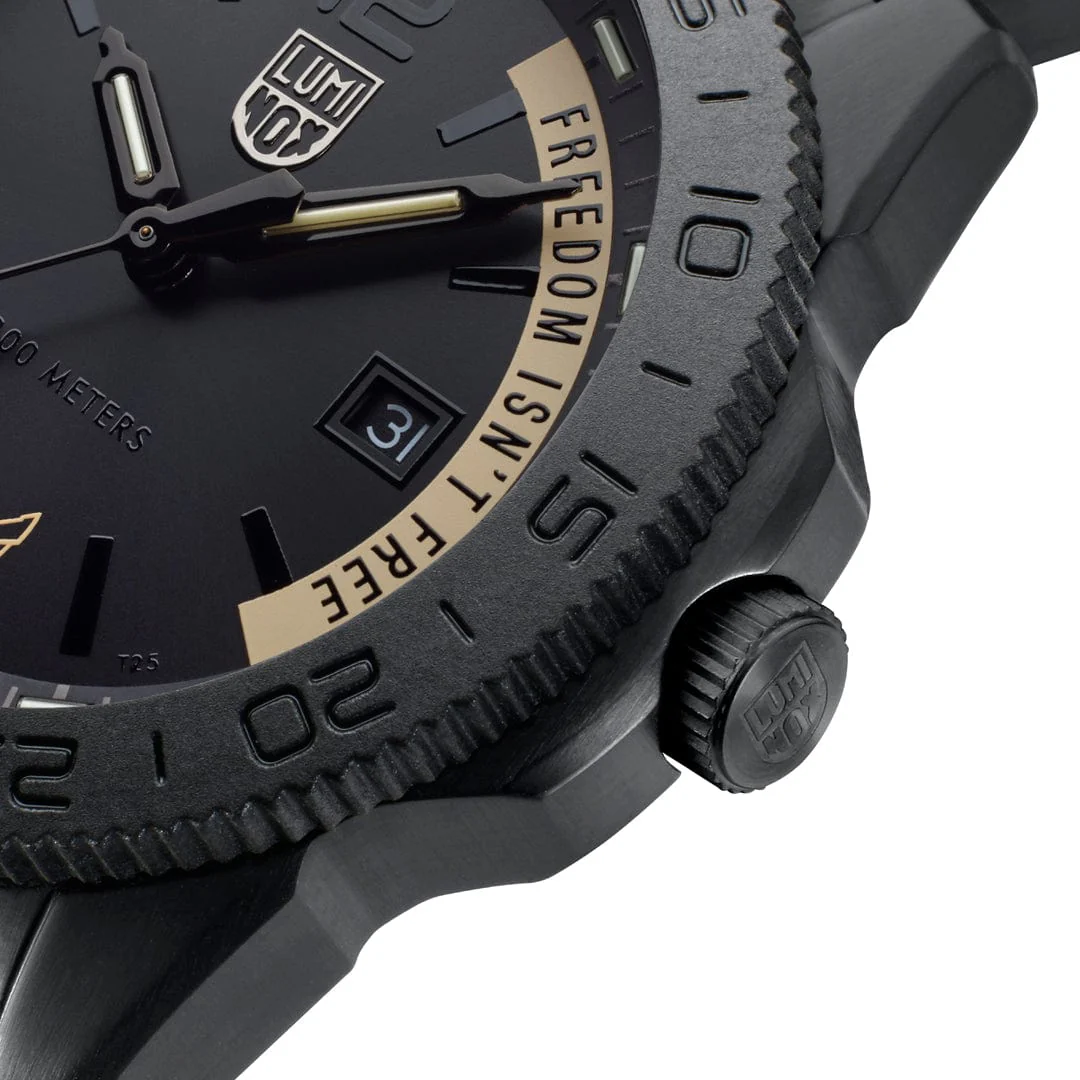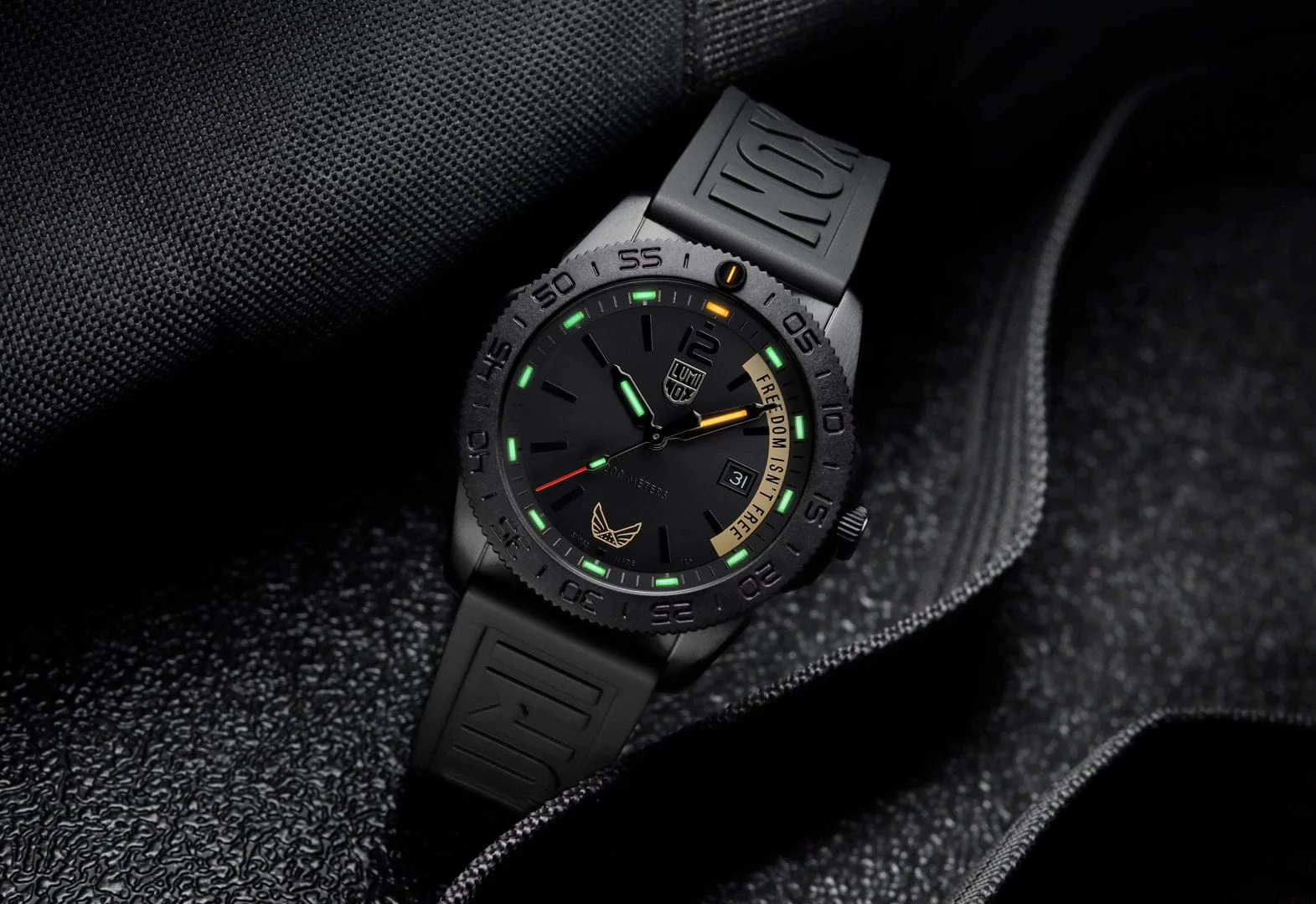 The Luminox x VOLITION AMERICA 'Freedom Isn't Free' Dive Watch reminds us to take a moment to appreciate those that have given the ultimate sacrifice in their service to this nation. This handsome timepiece sports a distinct blackout design, a golden VOLITION AMERICA logo above the six o'clock, and the titular motto on the dial's outer ring. Luminox and VOLITION AMERICA partner to benefit a greater purpose: with each watch sold, a portion of proceeds benefit Folds of Honor - a nonprofit organization that supports families and spouses of fallen or disabled military heroes through educational scholarships.