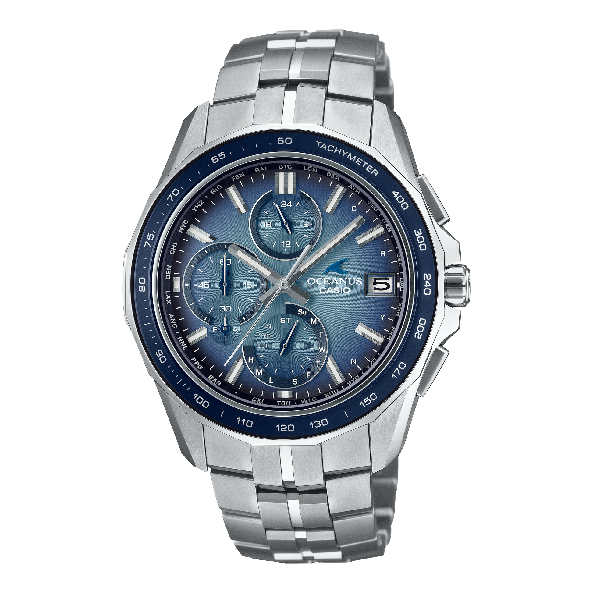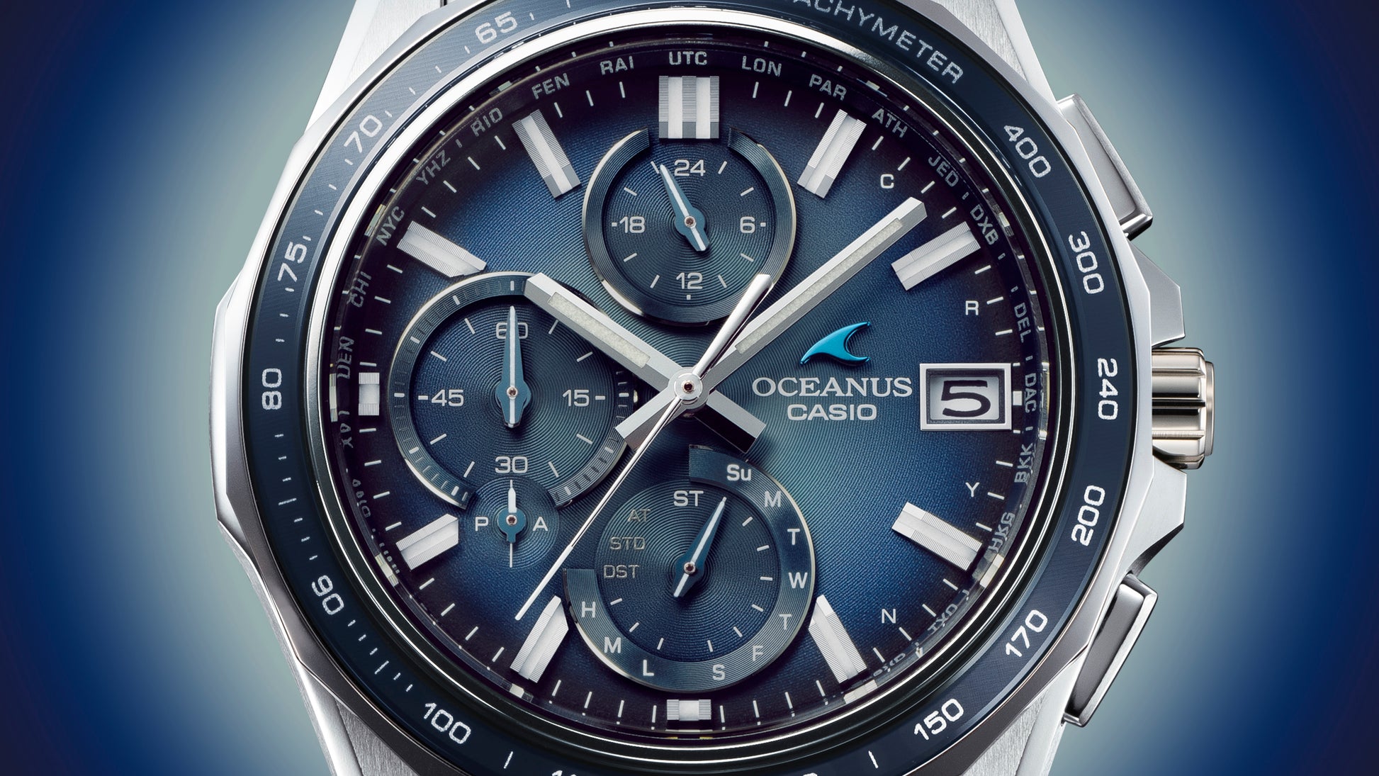 OCEANUS, which pursues high-quality finishes and multi-functionality under the brand concept of "Elegance, Technology," presents this model themed on a classic style that exudes timeless appeal. The dial features a semi-matte gradient finish, creating a tasteful expression in which color and light blend exquisitely from the center to the periphery. The bezel ring is made of sapphire crystal, the top surface of which has been laser-etched to create a harmonic finish. The surface of the material has a unique luster reminiscent of frost, and the soft light it captures brings out the color of the bezel in a rich and expressive way.