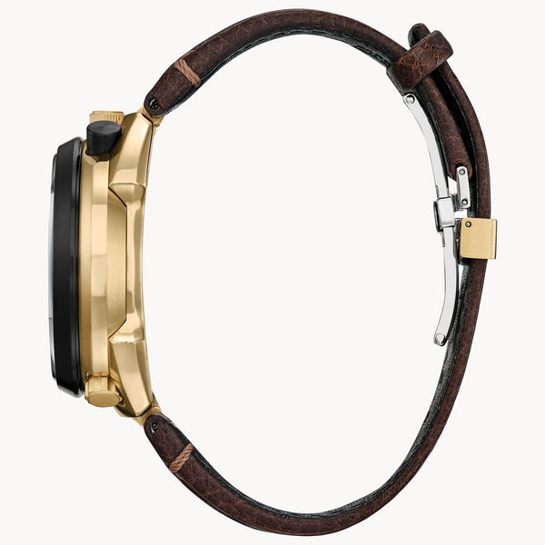The 50th Anniversary edition Promaster Tsuno Chrono Racer is a high-performance timepiece with an undeniably distinct design. Inspired by the original Citizen Bullhead from 1973, the uncommon chronograph features a 45mm two-tone stainless steel case secured by a sleek brown leather strap. With a gold-tone dial, the layout design makes use of four black sub-dials accented with red hands to create a dynamic and sporty aesthetic. Features of the timepiece include a hand assembled movement, a 1/5 second fly back chronograph that can measure up to 12 hours, an alarm, a power reserved indicator, and a date aperture. Maintaining the robust standards of the Promaster Collection, the watch is water resistant up to 200 meters. Powered by Citizen's proprietary Eco-Drive technology to provide light-powered vitality continuously and sustainably without ever needing a battery. Limited to 1,000 numbered pieces in the U.S. and 3,000 worldwide, each Tsuno Chrono comes in a special, gold-tone metallic Promaster box with a removable leather watch roll. Caliber E210.
