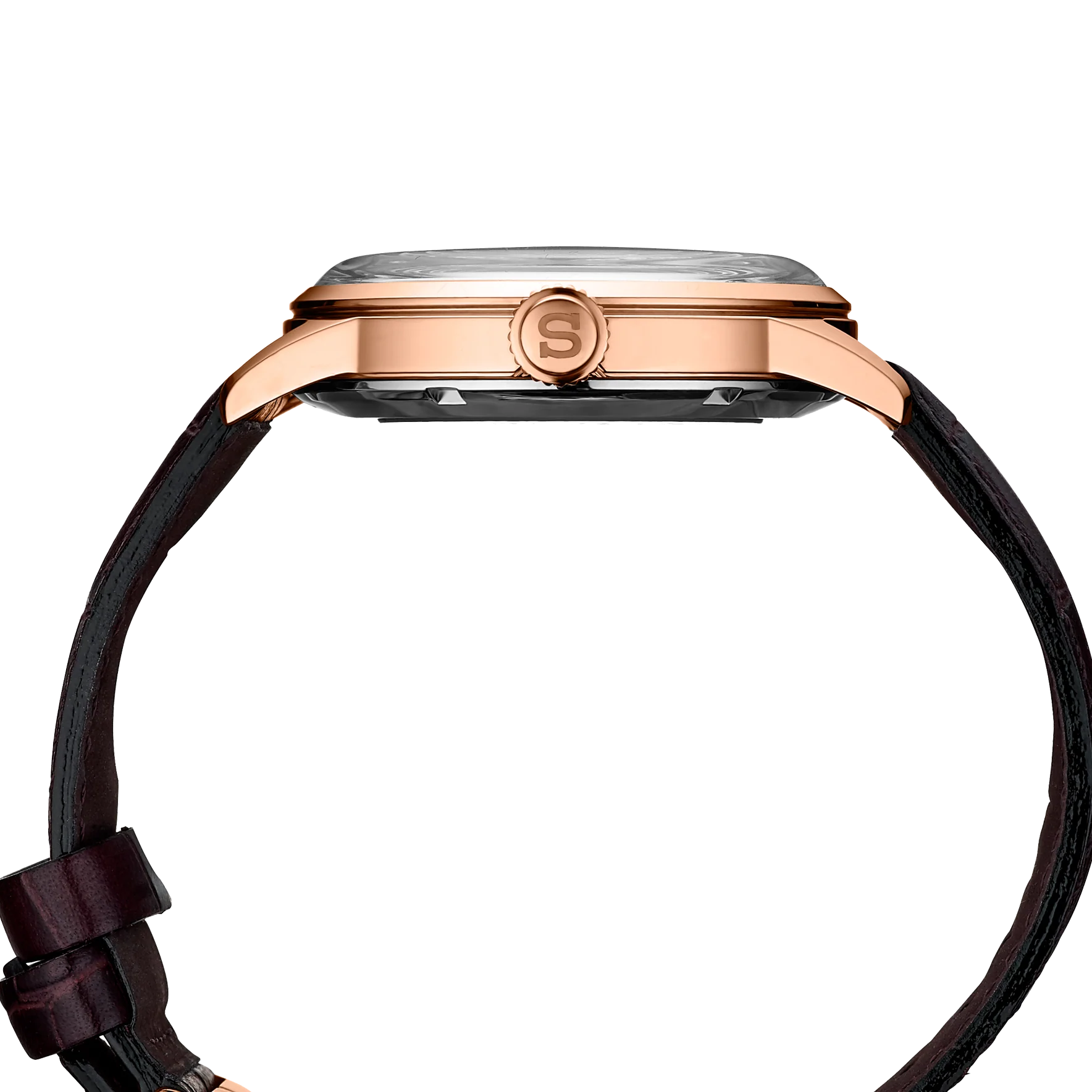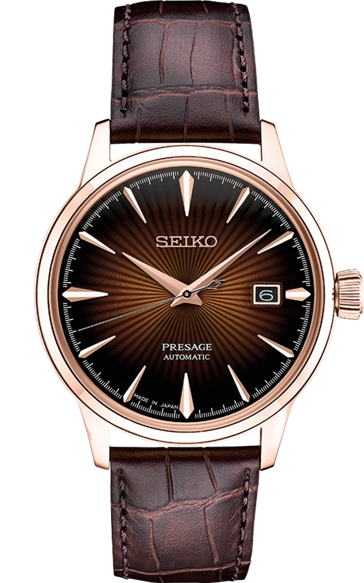 Seiko Presage Automatic. This refine men's watch is designed with a rose gold-finish stainless steel case and brown leather strap. The dial features a burgundy deep, pressed pattern whose shimmering beauty is enhanced by seven layers of gloss finish and the clarity of the box-shaped crystals. The hands are delicately curved by skilled craftsmen and women to give the watch case a slimmer profile. When turning the uniquely shaped crown, you can feel the strong torque of the winding mechanism. Automatic movement allows self and automatic winding capabilities and features 21,600 vibrations per hour, with a power reserve of approximately 41 hours, as well as 23 jewels. 50M Water Resistant