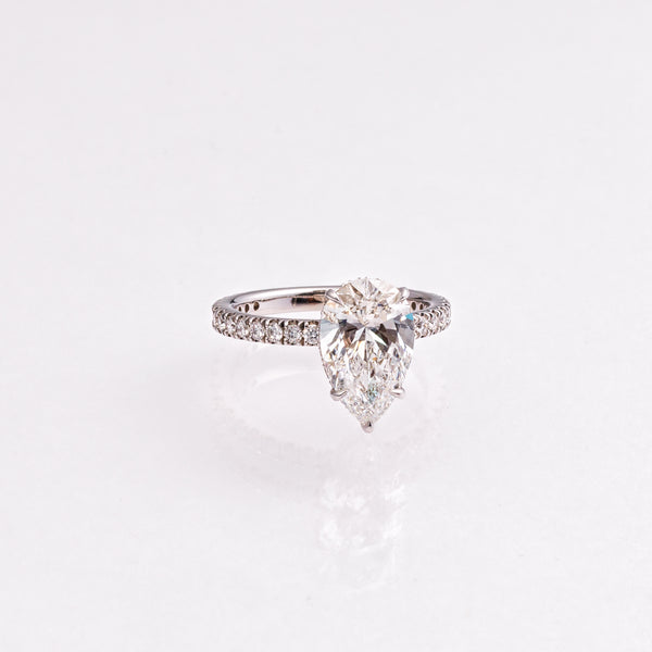 Introducing an exquisite engagement ring, showcasing a stunning 3.03-carat lab-grown pear-shaped diamond. This breathtaking ring features an E-color, VVS1 clarity diamond, ensuring exceptional brilliance and purity. The IGI certification guarantees its quality and authenticity. A delicate hidden halo accentuates the center stone, adding a touch of understated elegance, while the pavé band sparkles with meticulously set diamonds, enhancing the ring’s luxurious appeal. Perfect for those seeking a timeless yet modern symbol of love, this ring combines sophistication and sparkle in every detail, crafted in 14K white gold.