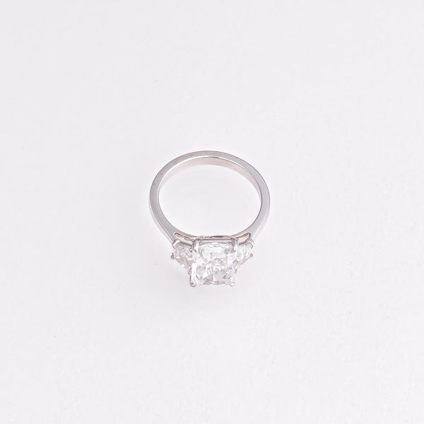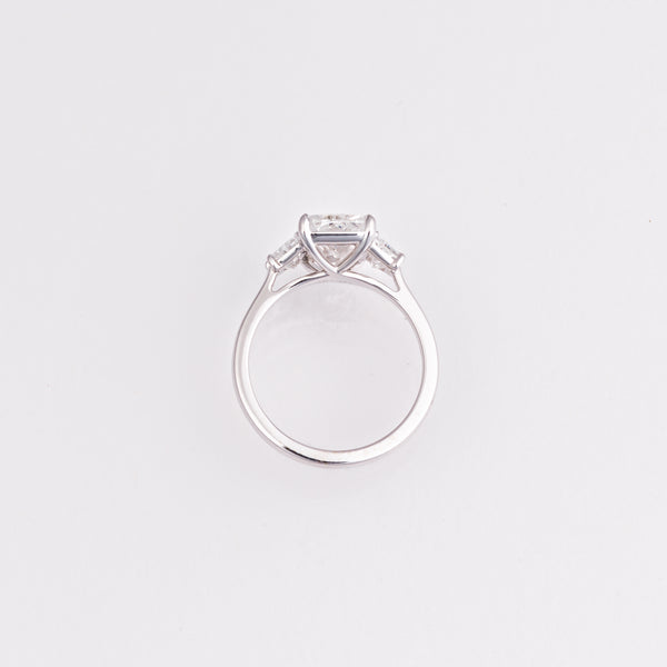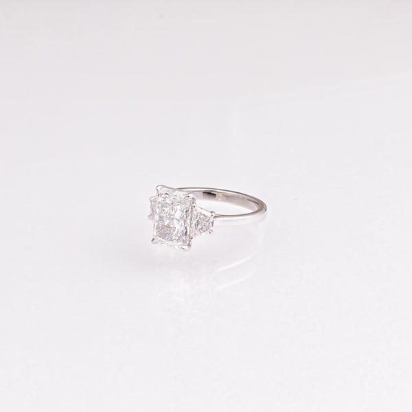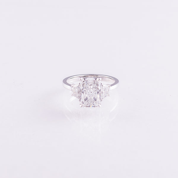 A contemporary interpretation of a timeless symbol, this three-stone engagement ring features a 3.09-carat radiant-cut lab-grown diamond at its center, framed by two perfectly matched side stones for a total of 3.91 carats. Expertly crafted in 14k white gold, the radiant cut showcases maximum fire and brilliance, blending modern geometry with classic elegance. The pavé-set band adds an extra layer of sparkle, ensuring light catches from every angle. A refined expression of past, present, and future—this ring embodies enduring love with modern sophistication.