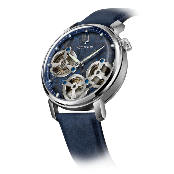 Accutron breaks the mold again with the Spaceview Evolution, now featuring striking forged carbon dials. An enigmatic swirl of color, the visual impact of the blue forged carbon dial is enhanced by a new closed dial. The remaining apertures allow the wearer to admire the forged carbon's evocative pattern as it sits in juxtaposition to the iconic spinning turbines and their silver-tone bridges and blue screws, while luminous hands and hour markers offer ideal legibility. Underpinning the exceptional dial is the groundbreaking NS30 electrostatic movement, the first of its kind, which is powered by twin turbines that harness energy created by even the slightest movement and deliver accuracy of -/+5 seconds per month. Housed in a stainless-steel case with a sapphire crystal and a matching luxurious navy suede strap with a folding clasp, the Accutron Spaceview Evolution Forged Carbon marks the latest in the ongoing story of the Electrostatic collection.