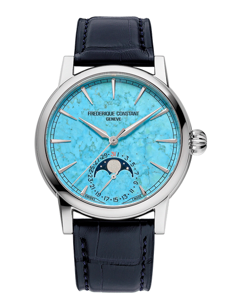 Discover timeless elegance and Haute Horlogerie with the Frederique Constant Classic Moonphase Date Manufacture, a timepiece that combines technical excellence with a spectacular design.This watch is a limited edition of just 716 pieces, making each example a unique collector's item, with its individual number engraved on the case back. The heart of this timepiece is its magnificent dial made of genuine blue Turquoise stone.