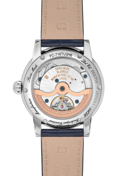 At the heart of the watch beats the in-house manufactured FC-716 calibre, an automatic movement developed internally by Frederique Constant. This calibre offers a generous 72-hour power reserve. The movement is a demonstration of the watchmaking art, decorated with Perlage and fan-shaped Côtes de Genève finishes. The threaded case back is engraved and see-through, offering a spectacular view of the mechanism in action. The 40 mm polished stainless steel case is protected by an anti-reflective convex sapphire crystal and is fitted with an elegant blue alligator leather strap.