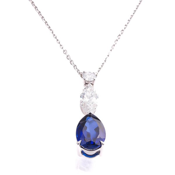 Discover sophistication in this pendant necklace, showcasing a 2.5ct pear-cut sapphire with vibrant blue hues, paired with a 1.09ct marquise diamond (D, VVS2) and a 0.20ct round diamond. Crafted in polished 14K white gold, this IGI-certified necklace blends elegance with responsibly sourced gems for lasting appeal.