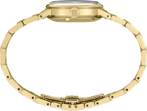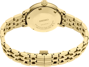 Seiko Presage Cocktail Time. Offering the finest in Japanese mechanical watchmaking, the Presage Collection blends precision technology with superior craftsmanship and design. Inspired by hot cocktails under the softer sunlight of autumn and winter, this Cocktail Time series expresses the tones and hues of the cooler seasons. Atop a lovely gradated golden pressed pattern dial evoking the Eggnog cocktail, four diamonds, artfully incorporated into the signature markers, add a luxurious sparkle to the extraordinary design. The gracefully slender case houses a slim, 21 jewel automatic movement, which beats at a frequency of 21,600 vibrations per hour, with a power reserve of approximately 41 hours and manual winding capability. Crafted of stainless steel with gold finish, this sleek timepiece includes an elegantly tapered five-row bracelet, with mirror finish for added brilliance, as well as a date calendar, box shaped crystal, and deployment clasp with push button release. 5 bar, 50M Water Resistant