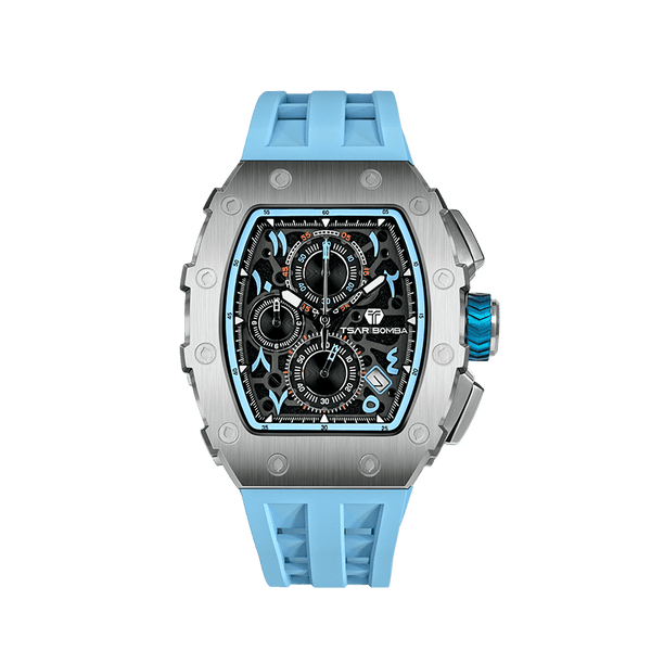 The TSAR BOMBA Arabian Legacy TB8204QA features a 43 mm stainless steel case with bio-ceramic bezel, sapphire crystal, and Seiko VK67 quartz movement. It includes a silicone strap, AlphaLuminex lume, and 5 ATM water resistance, blending strength with modern style.