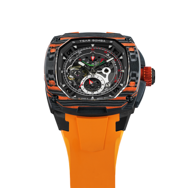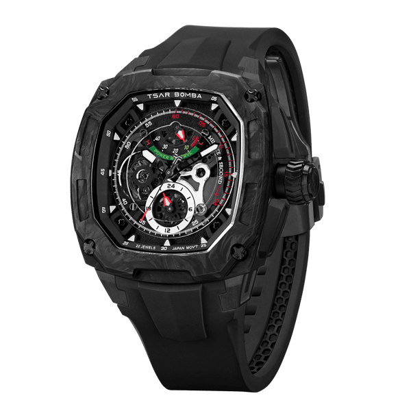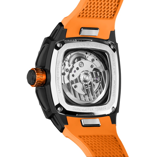 The TSAR BOMBA Dark Matter 2 is an automatic watch with a 316L stainless steel case, sapphire crystal, and Miyota movement. It features an interchangeable FKM rubber strap, AlphaLuminex lume, and 5 ATM water resistance, blending durability with modern style.