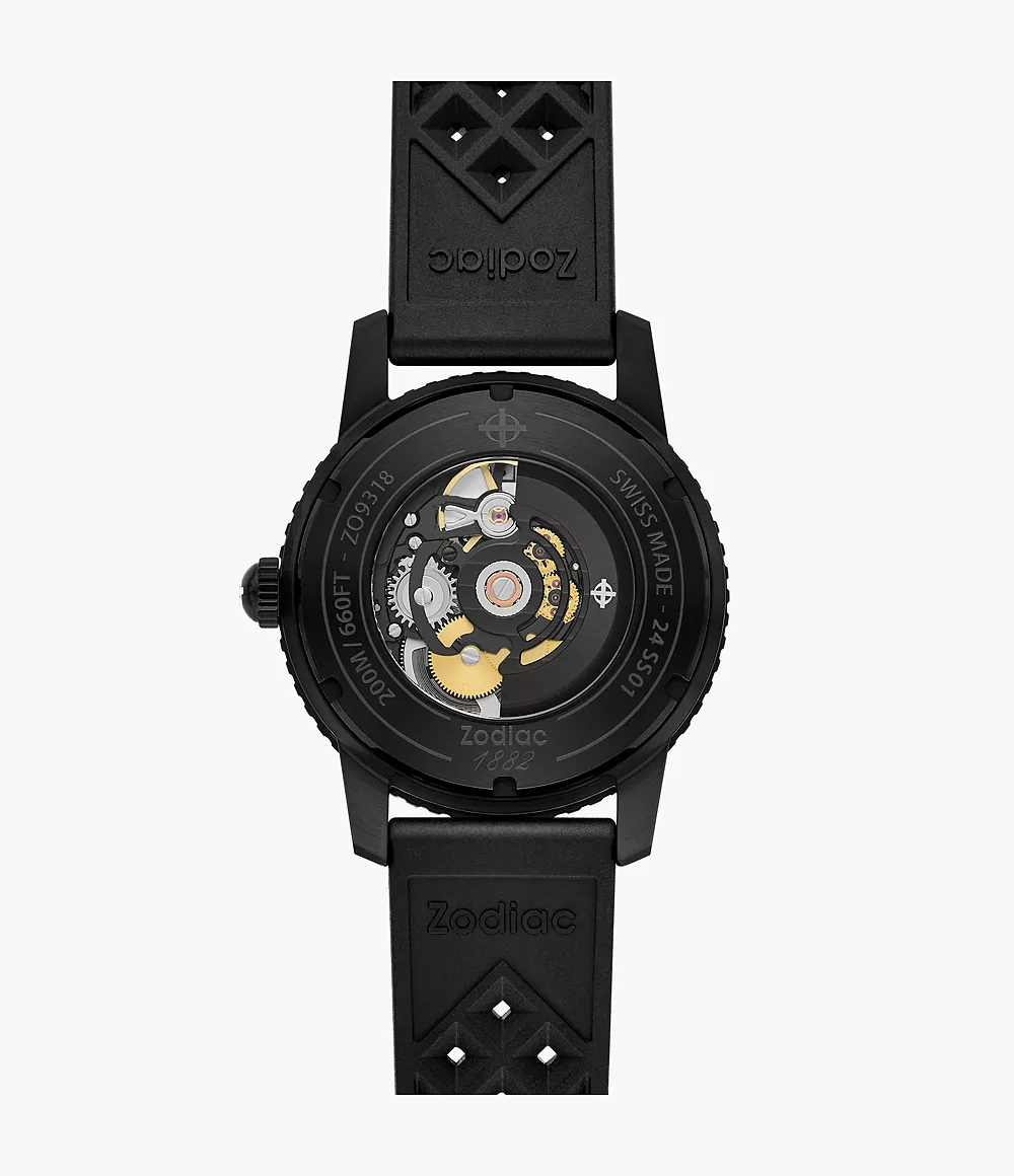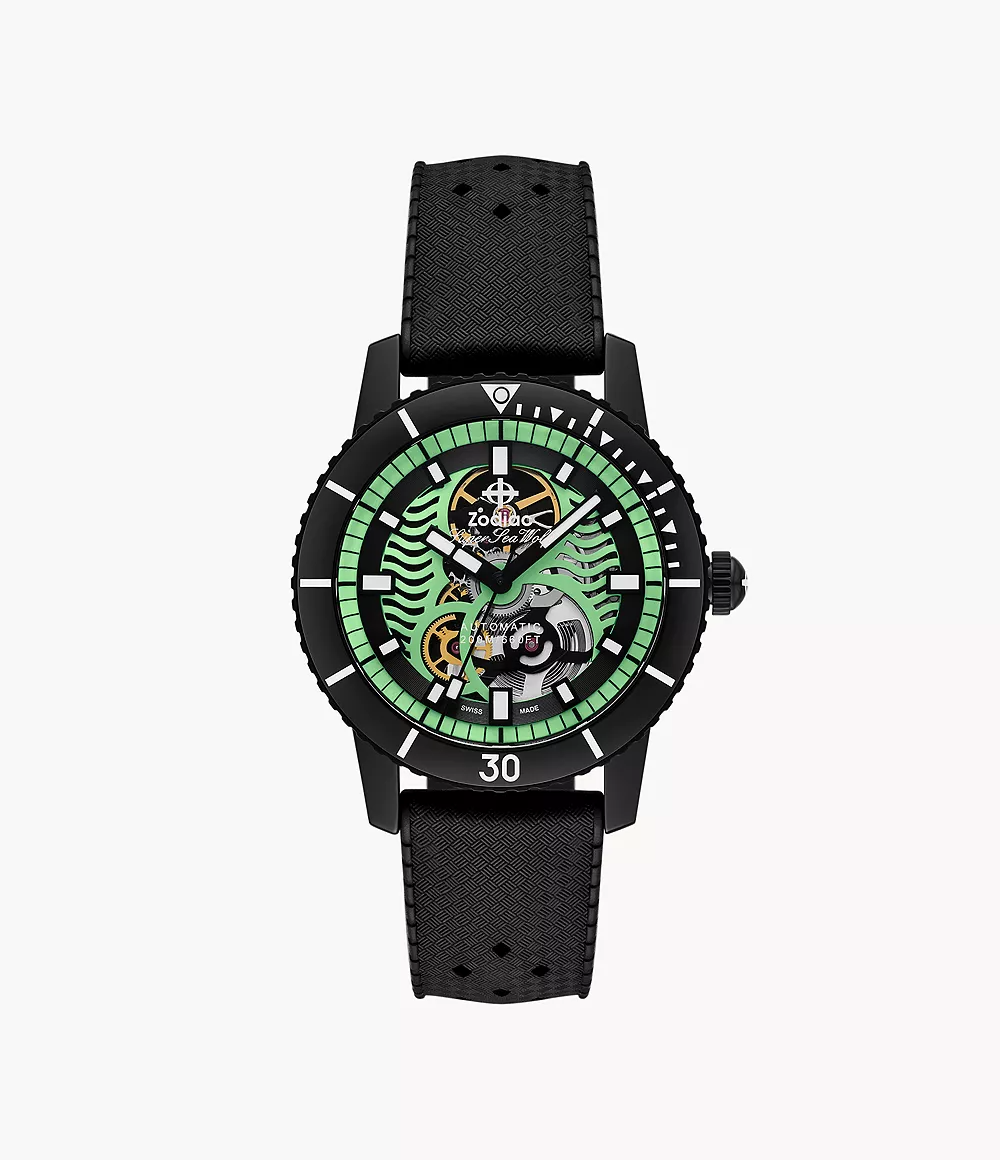 Zodiac's 40mm Compression Diver watch features a green Super-LumiNova® matte dial, STP6-21 automatic movement and black rubber strap.