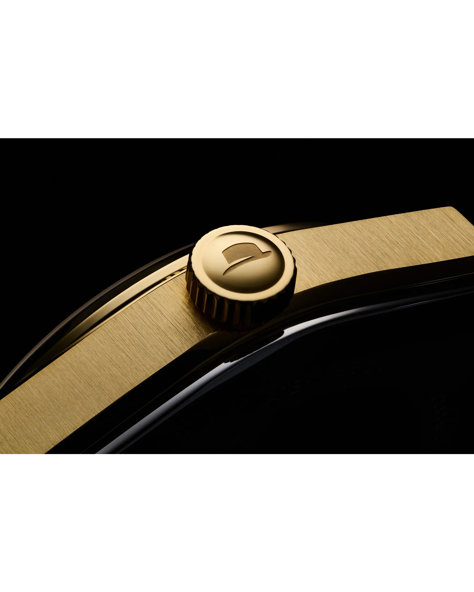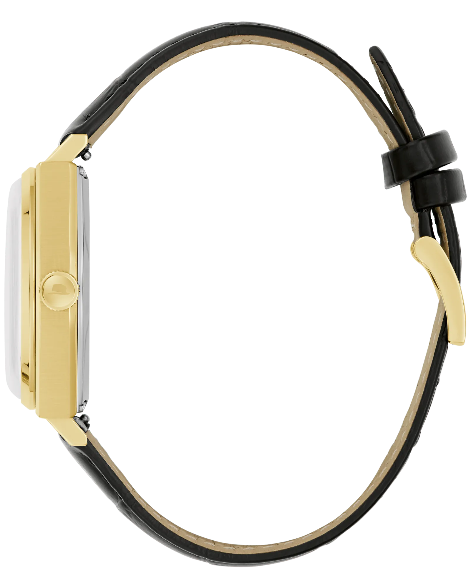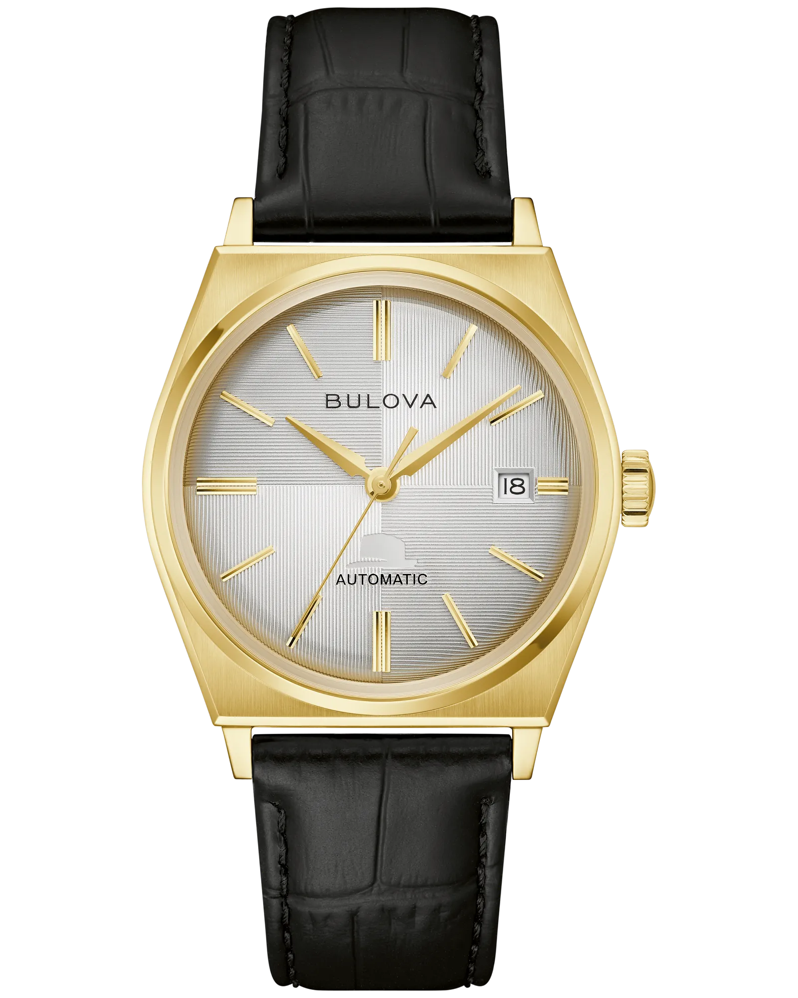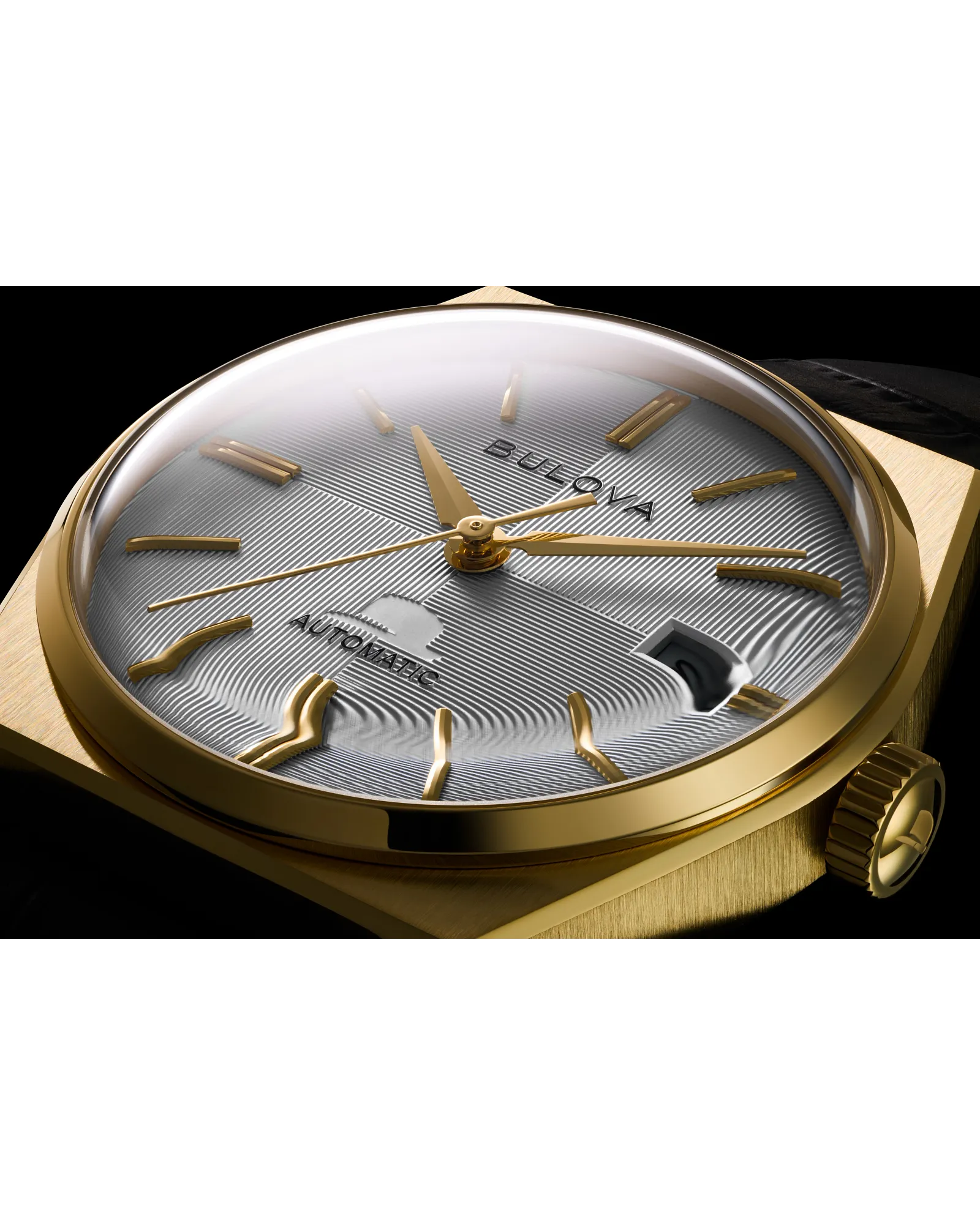 Inspired by the classic 1967 Bulova Banker watch, this Bulova Frank Sinatra men's timepiece keeps things cool with upscale, vintage styling. The luxurious design and finishing garner this watch the "Nothing But The Best" moniker, the gold-tone stainless steel case showing off its dual finishing and unique shape while an alligator-pattern leather strap adds a perfect complement. Under a boxed sapphire crystal, the silver-white dial captures the heart like Sinatra's melodies, with alternating textured lines creating depth and gold-tone hands keeping the beat as Sinatra's signature fedora is subtly pressed at 6 o'clock. The automatic movement is visible through a caseback crystal emblazoned with Sinatra's fedora and signature, and it delivers 42 hours of power on a full wind. Capture the spirit and style of Sinatra's legendary charm with this Bulova men's watch.