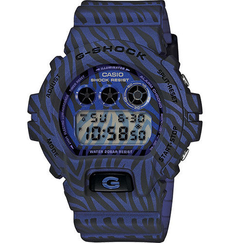 The zebra camouflage pattern of the DW6900 models make these watches perfectly suited to today's street fashion scene. A new multi-angle printing technology was applied to create the case and band patterns of these models, as well as the camouflage patterns of their dials. DW6900ZB -2 is a digital watch with blue zebra camouflage pattern.