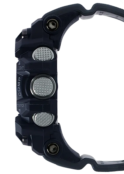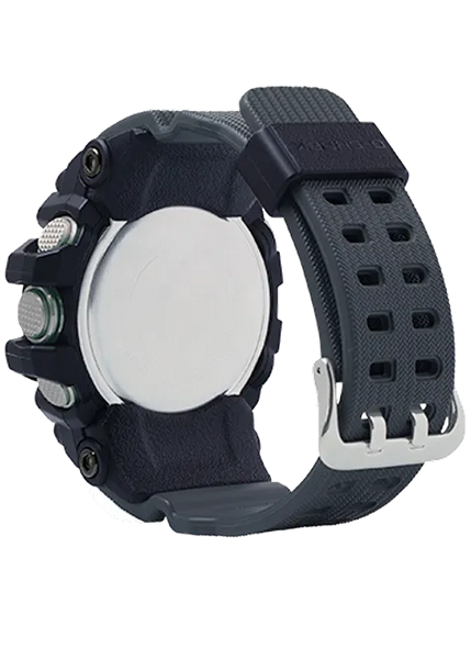 This is the latest new addition to the MASTER OF G MUDMASTER Series. Mud Resist construction helps to ensure that nothing gets into the watch when down and dirty work takes you deep into the dirt and sludge. Multiple gaskets are used on the pipes that guide buttons and shafts, which keeps mud out. These pipes not only act to protect buttons from impact, they also enhance button operation. In addition, Twin Sensor capabilities provide instant access to direction and temperature information when needed under tough conditions. The face of the watch is marked with large Arabian numerals at 12, 3, 6, and 9 o'clock for easy reading. The face is illuminated by a Super Illuminator, high-brightness auto LED light to ensure high visibility under virtually any conditions imaginable. The band surface is processed to resemble a cloth band texture, and the hour and minute hands are shaped with points that make them resemble warning markers. All buttons have a checkered surface for surer operation, and the overall design is tough and rugged.